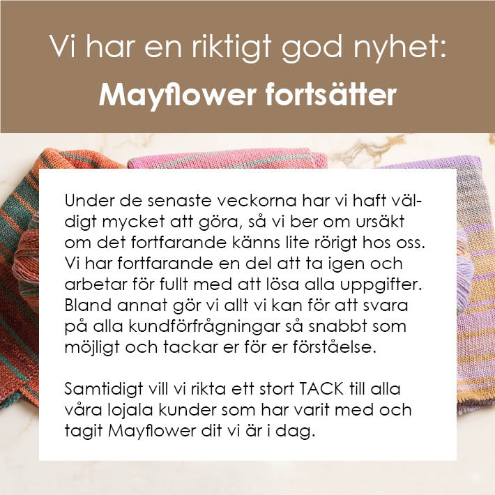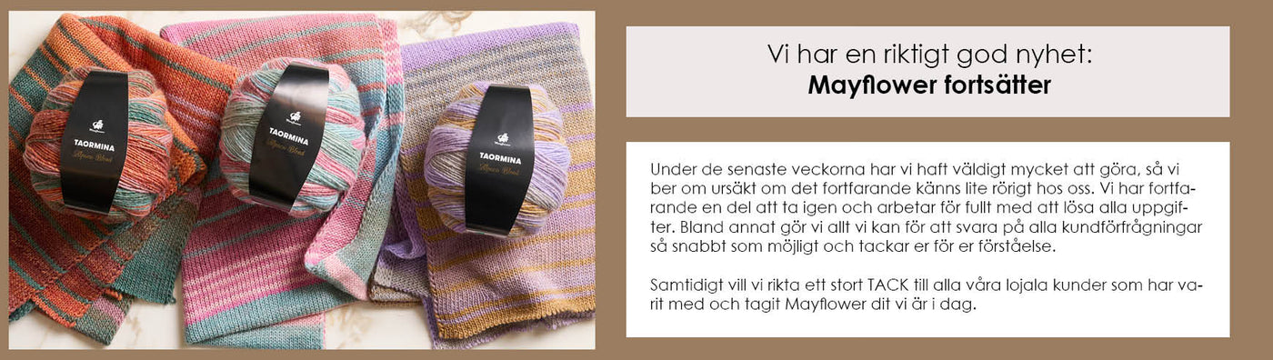 Mayflowergarn kännetecknas av hög kvalitet, både när det gäller klassiska och nya fiberblandningar, samt ett stort urval av färger. I Mayflowers sortiment hittar du garn för alla typer av plagg – från varma mössor och ullstrumpor till härliga stickade tröjor. Vårt stora utbud av mönster växer hela tiden och består av en bra blandning av tidlösa klassiker, aktuella sticktrender och charmiga retro-mönster.