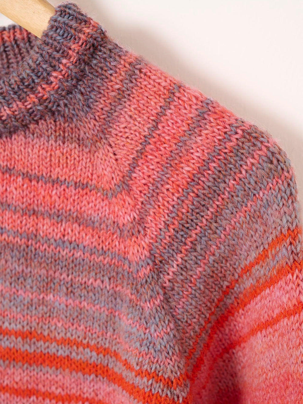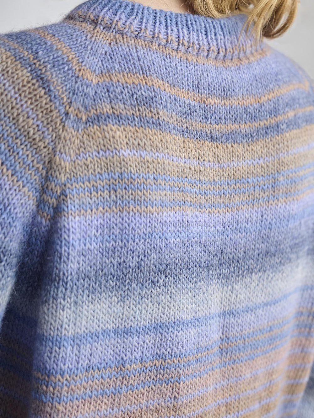 Taormina är en mjuk alpackablandning, men garnet är särskilt anmärkningsvärt tack vare sina vackra färger. När du stickar Anita-tröjan behöver du inte tänka på färgskiftningar, utan kan istället njuta av hur garnet själv skapar de vackra ränderna.