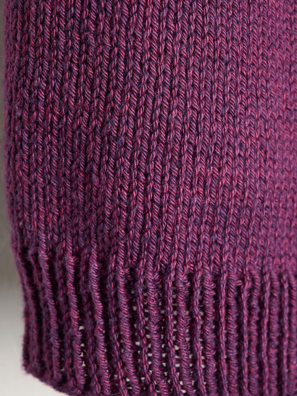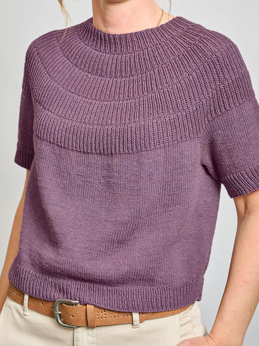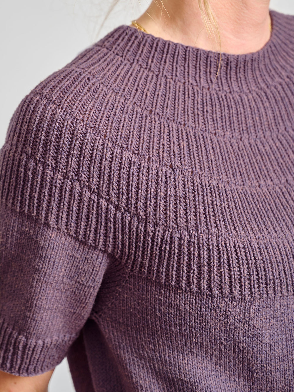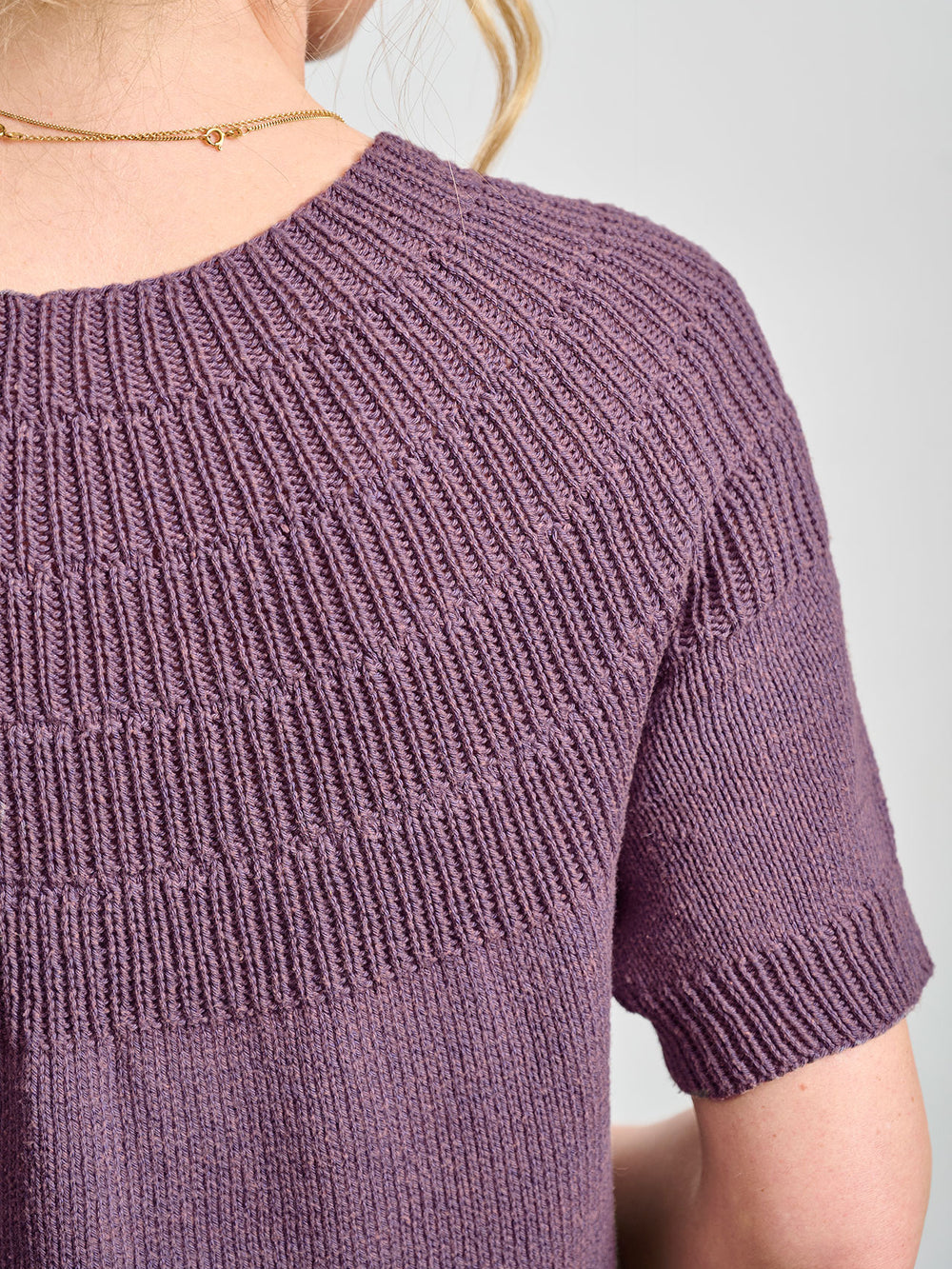 Anker Tee från PetiteKnit stickas uppifrån och ner med ribbstruktur i oket och slätstickning på bålen.
