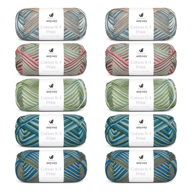 Anyday Cotton 8/4 Print erbjuds i paket om 10 nystan, som innehåller 2x5 nystan i fem olika prints.