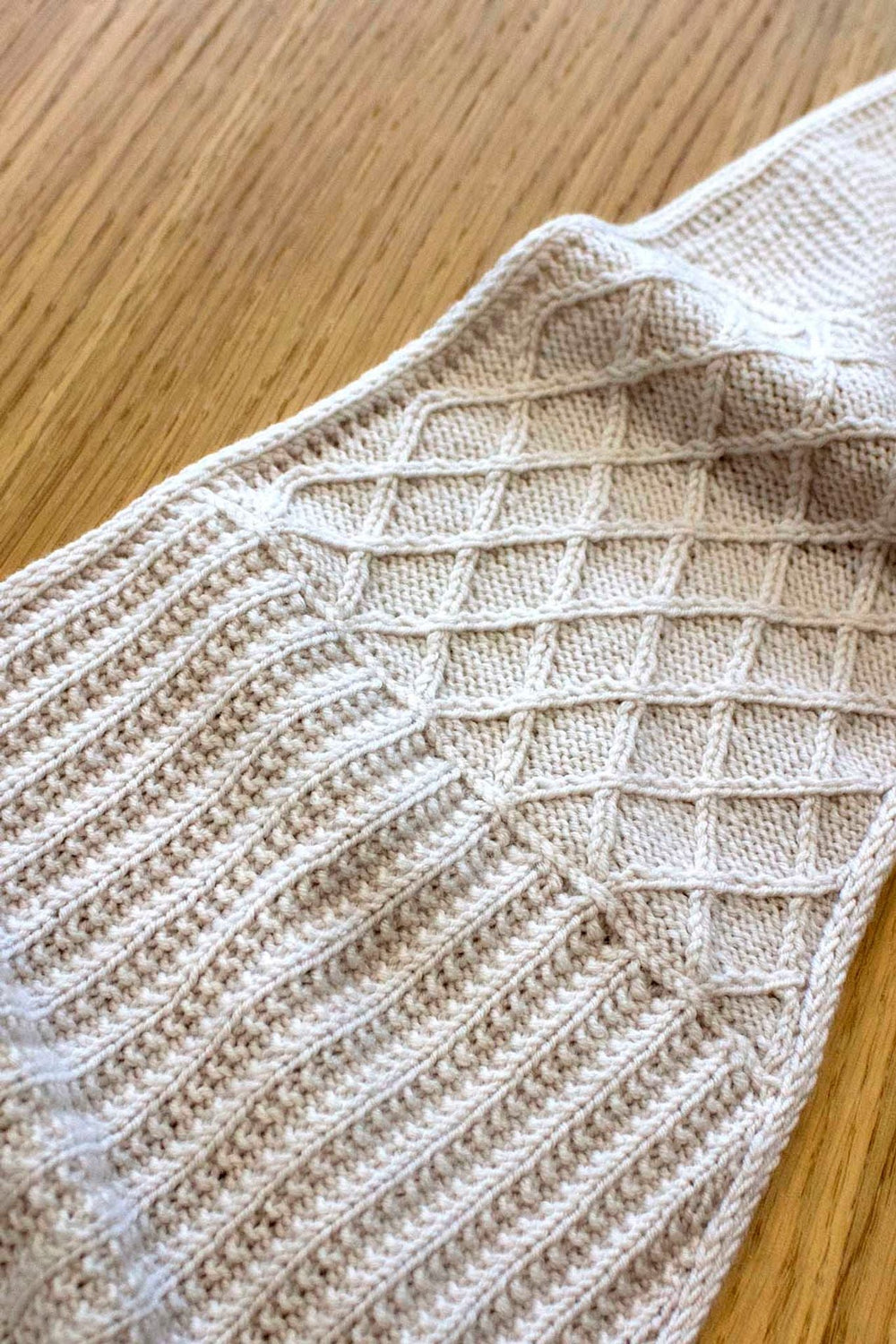Berlinhalsdukens utmärkta design slutar inte där. Den är nämligen stickad med sex olika tekniker och mönster, vilket gör den detaljerade halsduken verkligen intressant att titta på. Halsduken avslutas snyggt med en i-cordkant. Varje mönster delas upp av en rad med vertikala maskor. Vi har gjort en liten videoguide till detta som du kan hitta här.