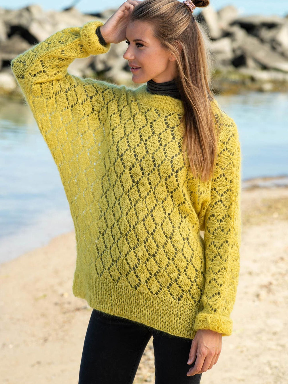 Hålmönster är en underbar stickteknik som ger ett lätt och luftigt uttryck i plagget. I det här mönstret bildar hålmönstret vackra harlekinrutor som täcker både kroppen och ärmarna. Den luftiga känslan förstärks ytterligare av de snygga fladdermusärmarna.