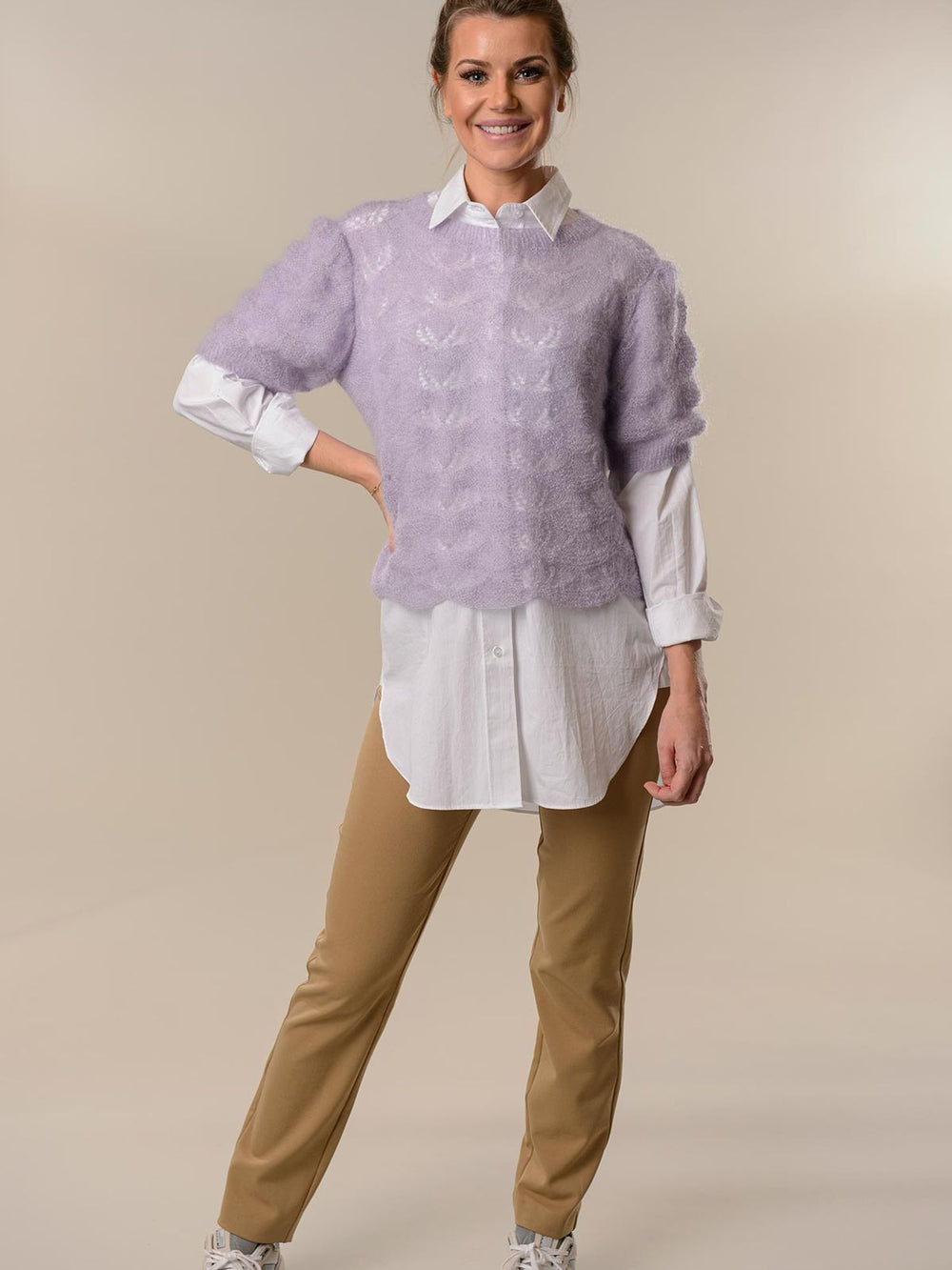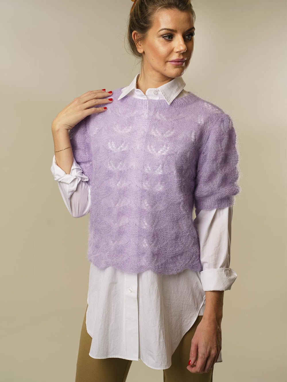 Blusen har ett vackert hålmönster som löper över både ärmar och bål. Super Kid Silk är ett fjäderlätt garn med lång löplängd, vilket gör det perfekt för spetsstickning och mönster med luftiga detaljer – resultatet blir alltid lika elegant.