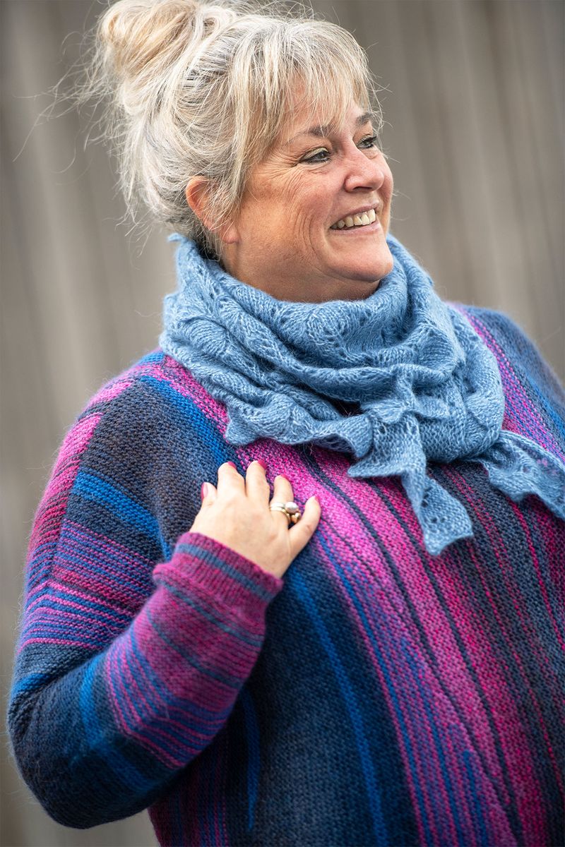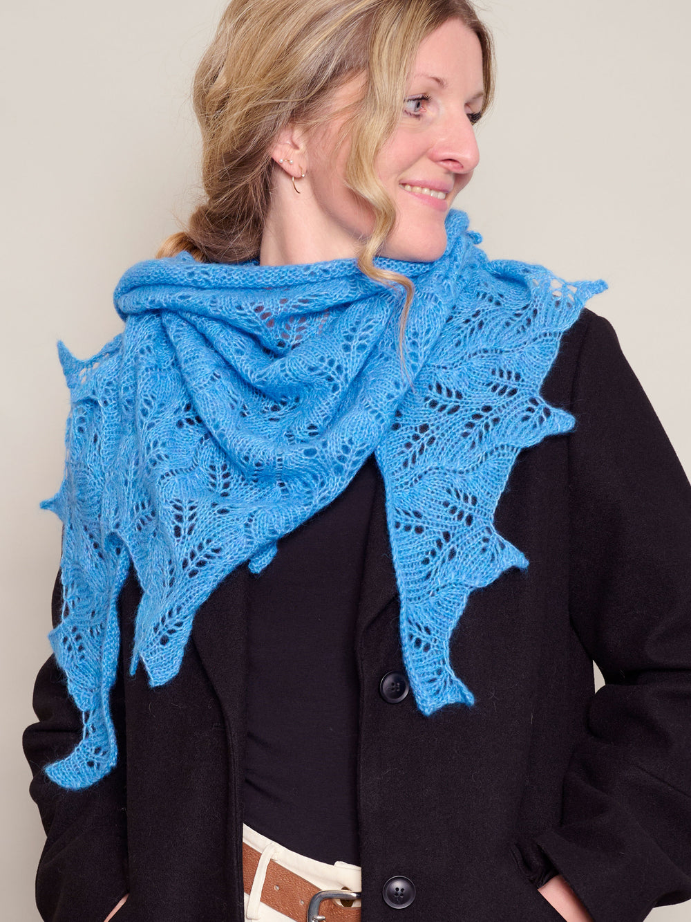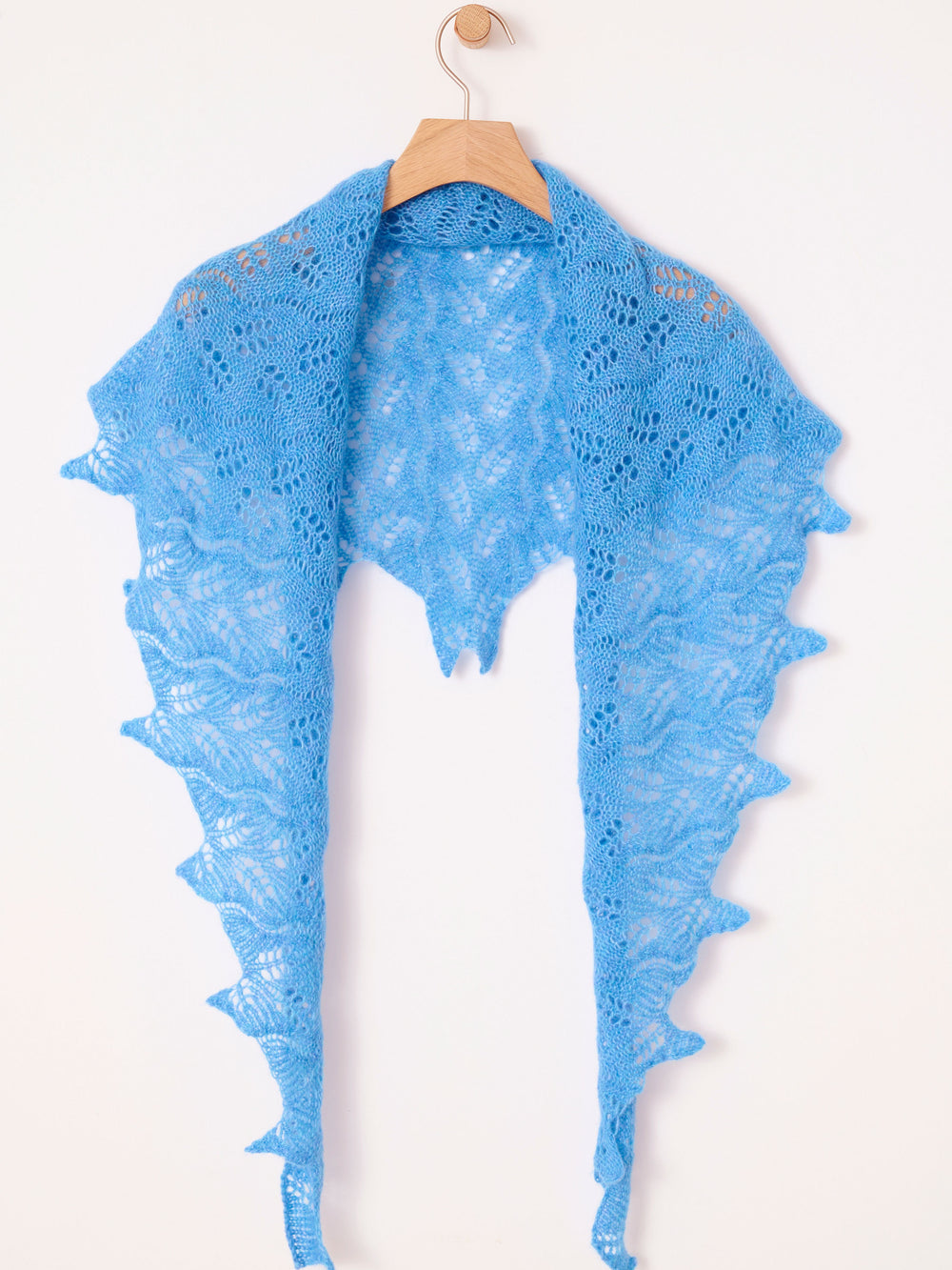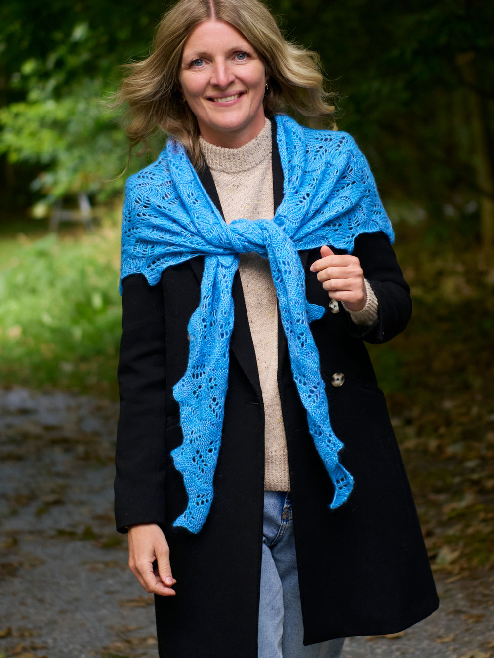 Sjalen är stickad i en färg, vilket ger den en fin balans och ett lugn där mönstret är i fokus. Den naturliga meleringen i garnet ger sjalen ett vackert färgspel.