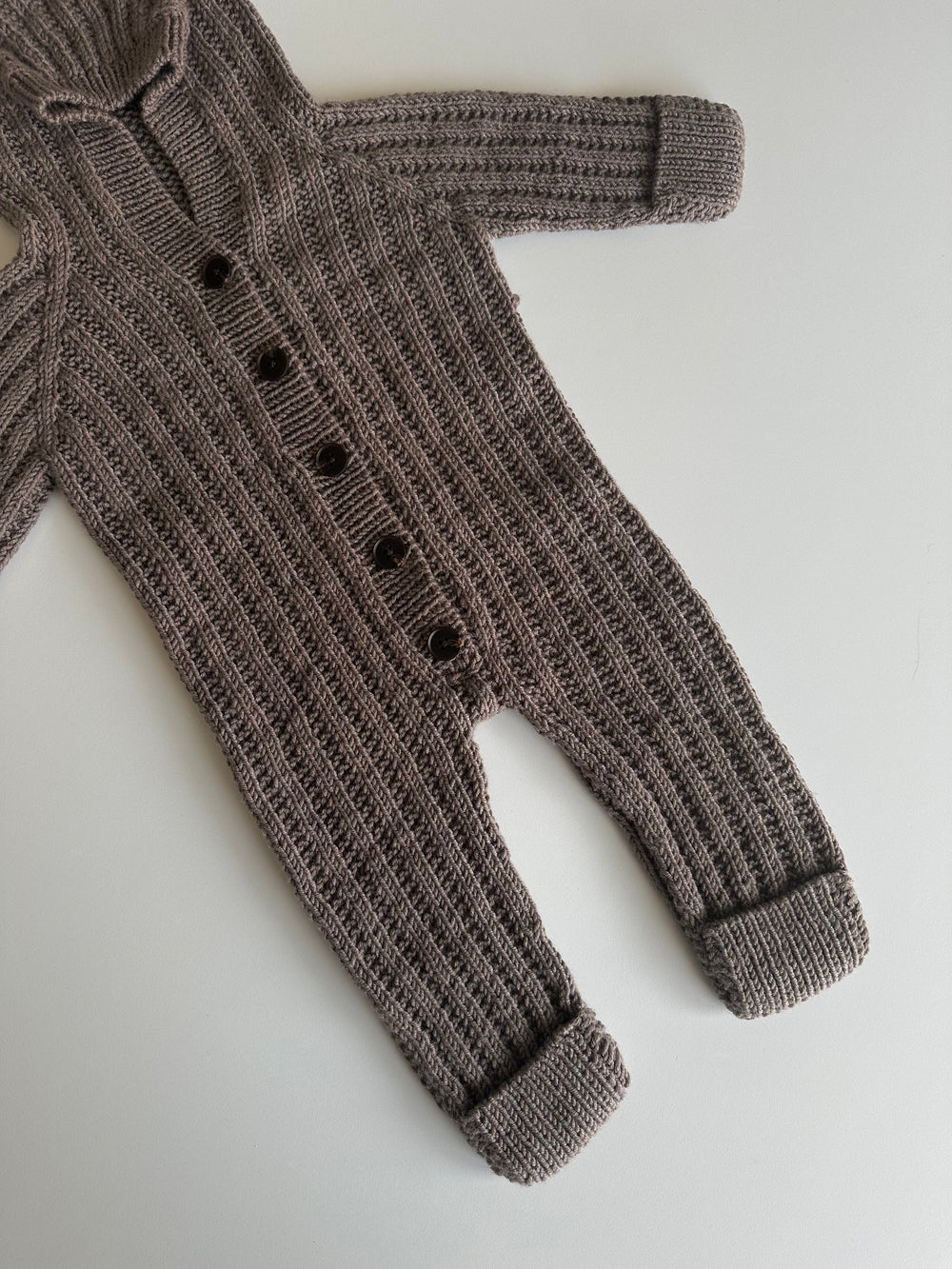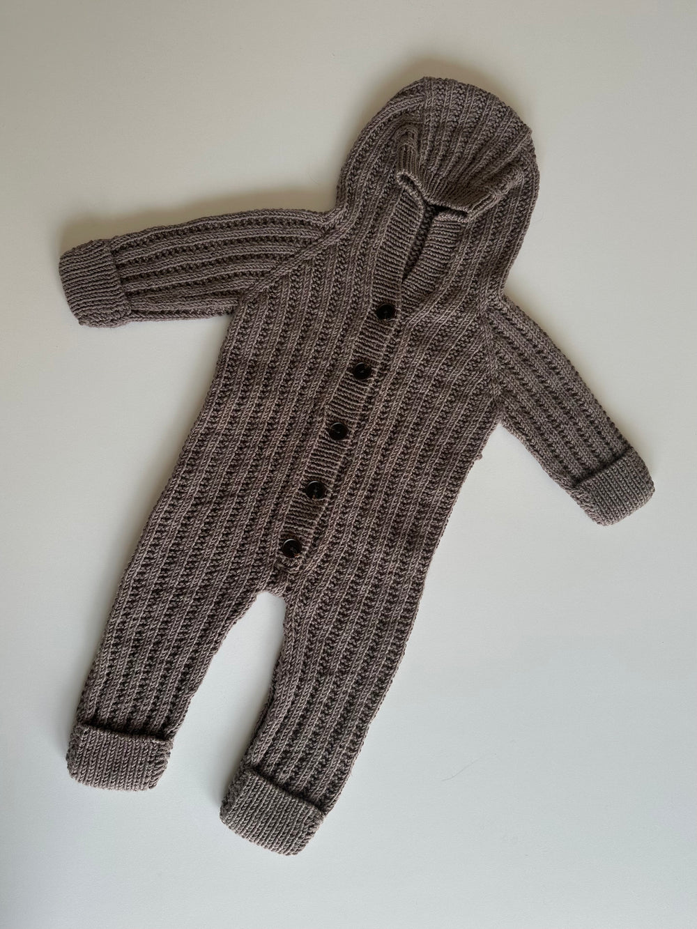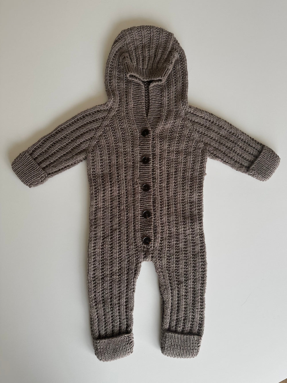 Overallen stickas uppifrån och ner med huva, raglanärmar samt runtstickade ben och ärmar med minskningar. Avslutningen består av en knappslå med knapphål och knappar, och längst ner på ben och ärmar sys små lappar för optimal passform.