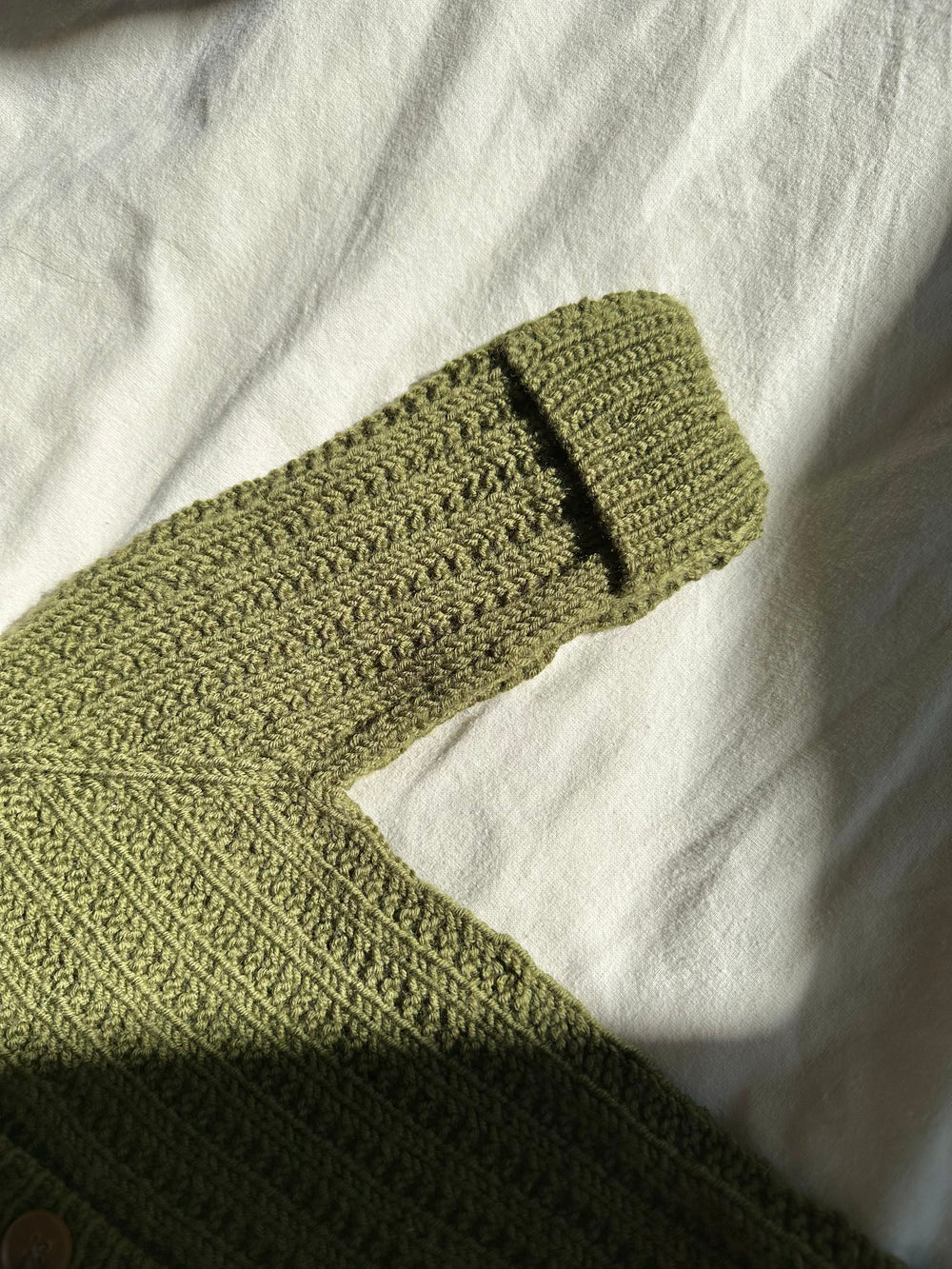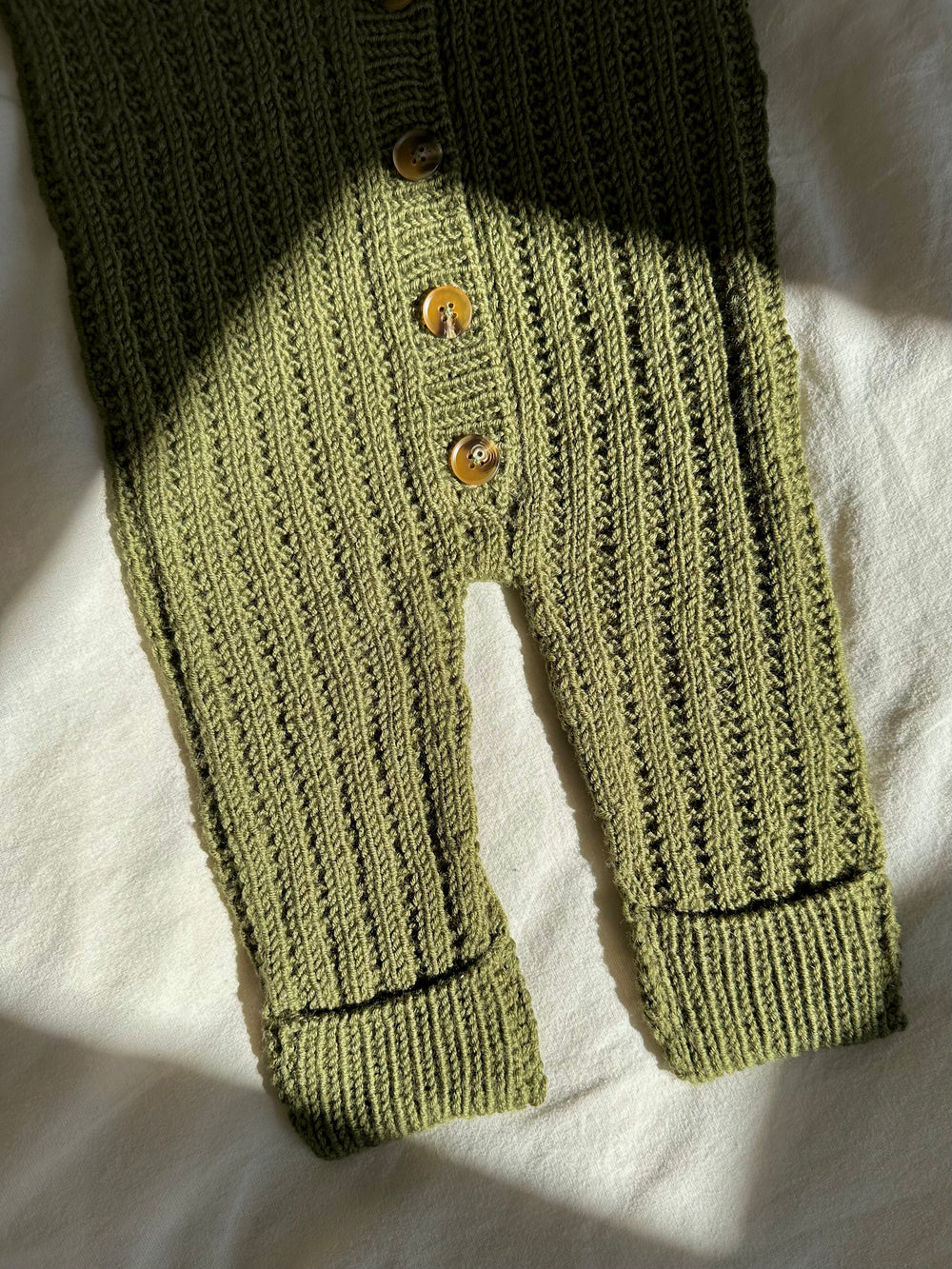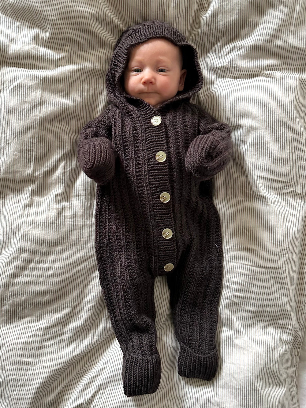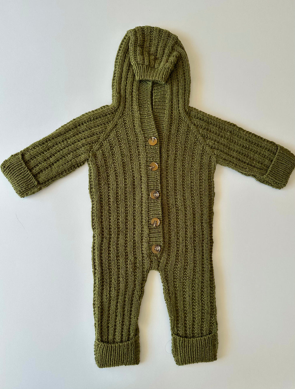 Overallen stickas uppifrån och ner med huva, raglanärmar samt runtstickade ben och ärmar med minskningar. Avslutningen består av en knappslå med knapphål och knappar, och längst ner på ben och ärmar sys små lappar för optimal passform.
