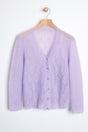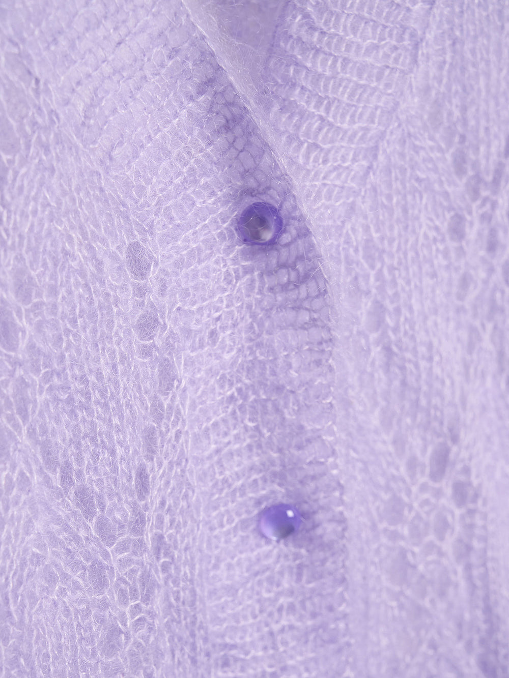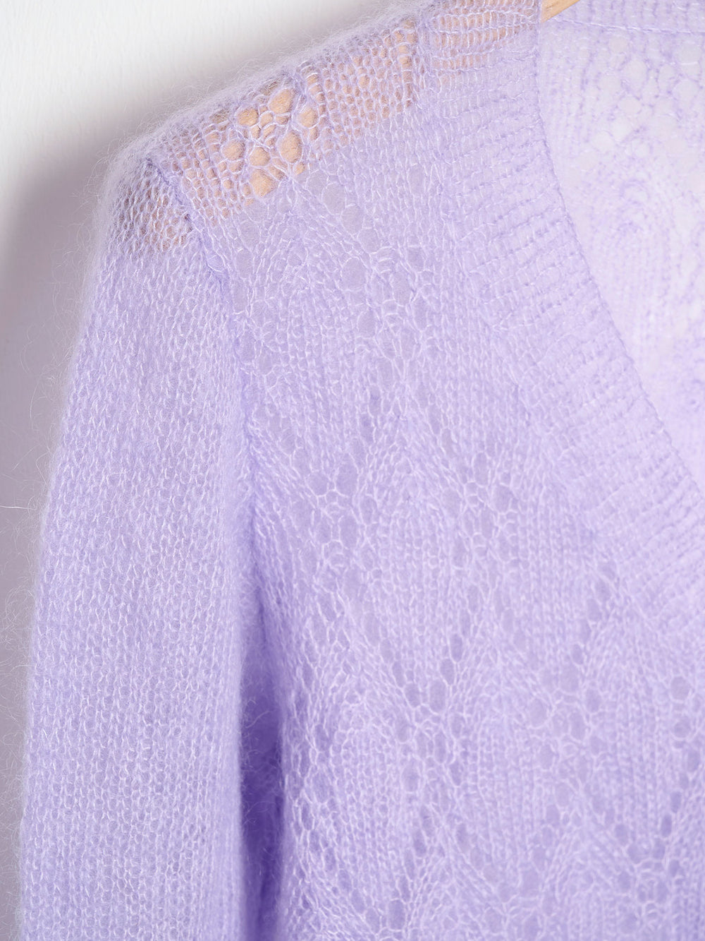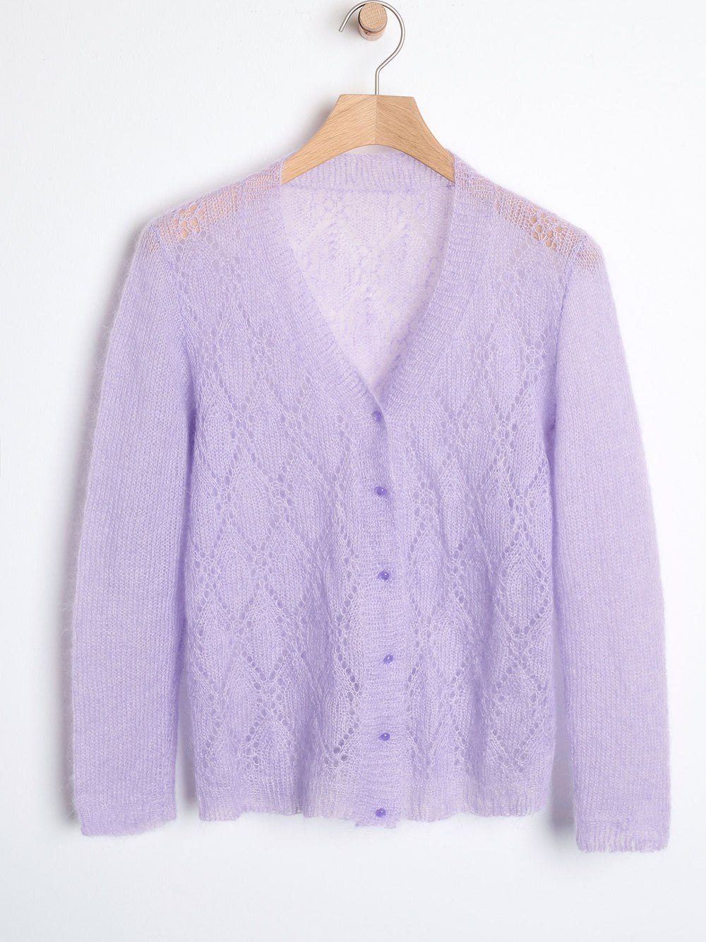 Super Kid Silk är särskilt känt för sin fjäderlätta känsla, vilket passar perfekt till denna design. Hålmönstret framhäver garnets luftiga egenskaper och ger ett exklusivt uttryck i den färdiga cardiganen.