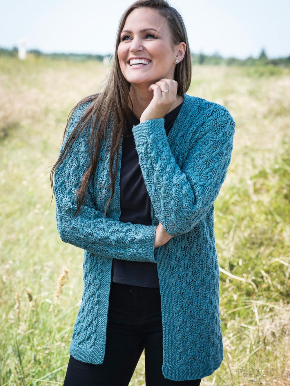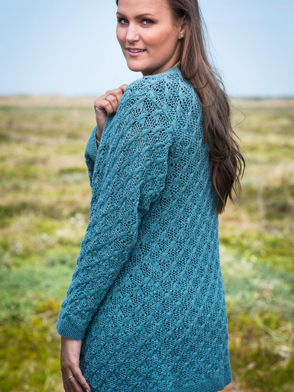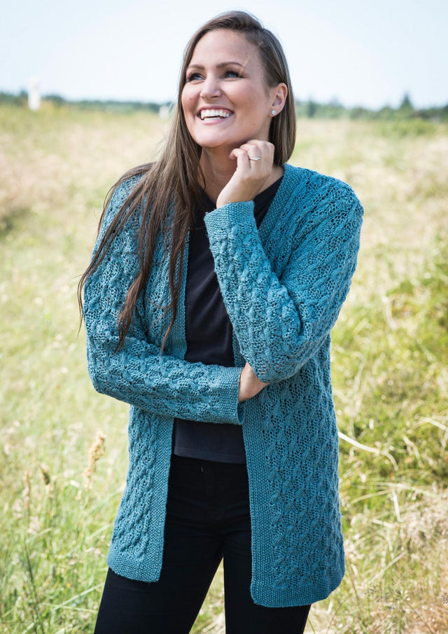Denna cardigan har det vackraste hålmönstret, som kombineras med flätor. Mönstret avslutas med snygga kanter i moss-stickning, vilket gör cardiganen ännu mer unik.