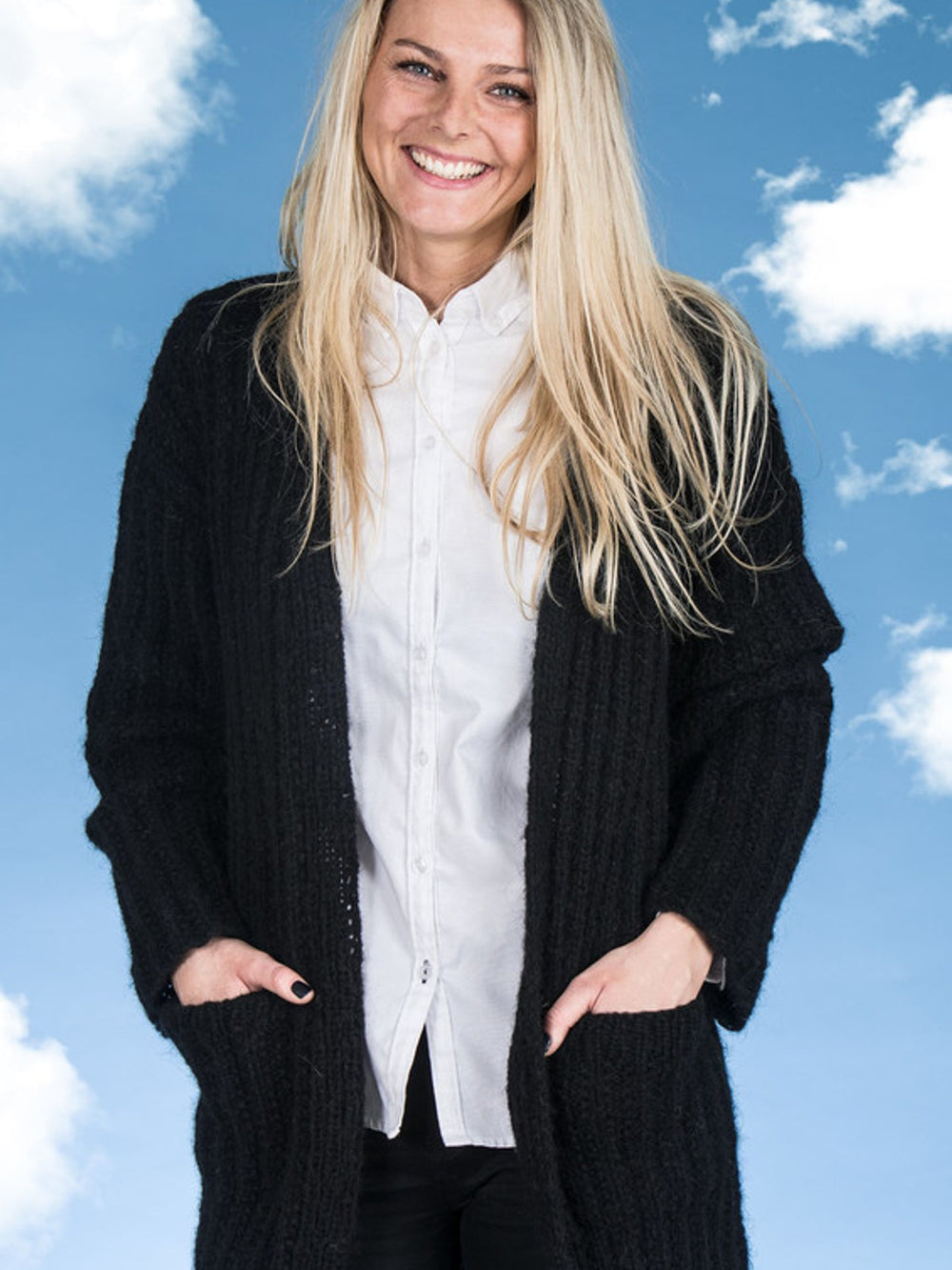 Enkel och bekväm kofta som ursprungligen stickades i det mjuka Mayflower New Sky. Vi har nu ersatt New Sky med Santiago – ett garn som uppfyller samma krav. Koftan är lång och värmande, och dessutom försedd med praktiska, djupa fickor.