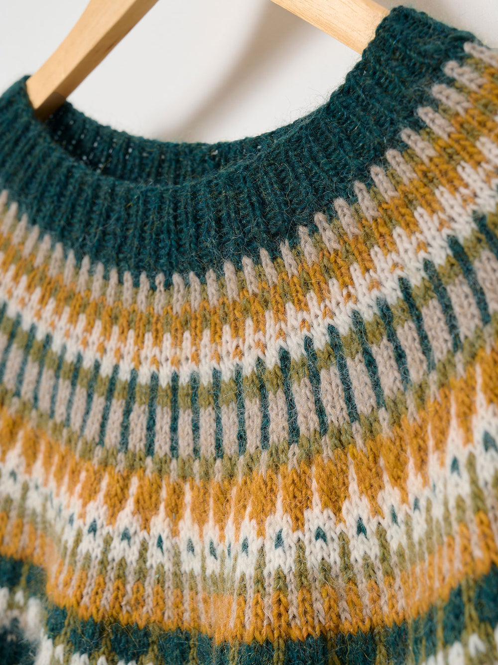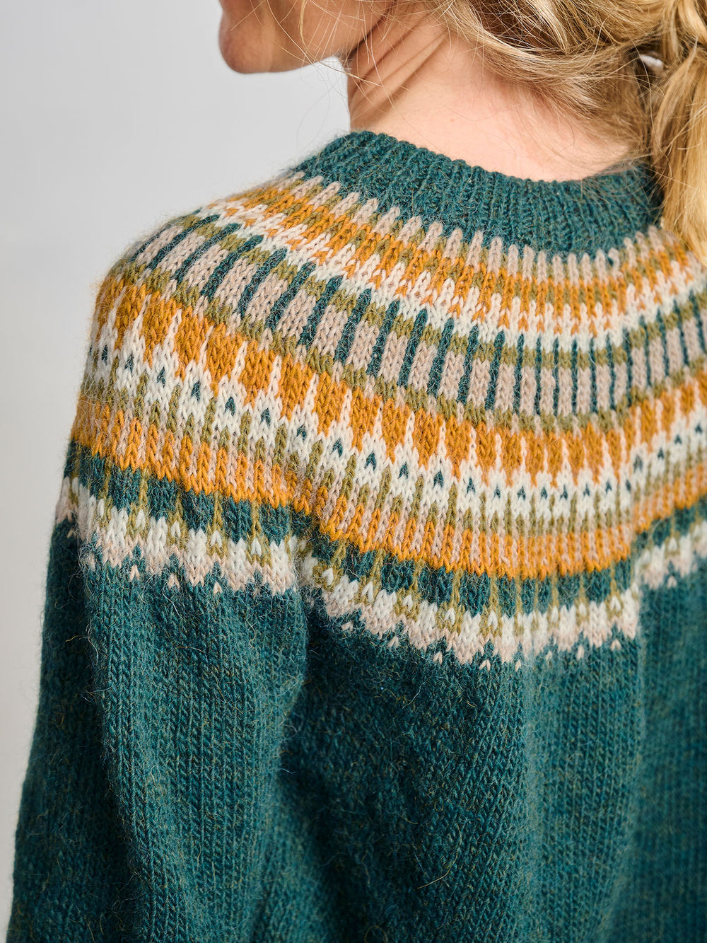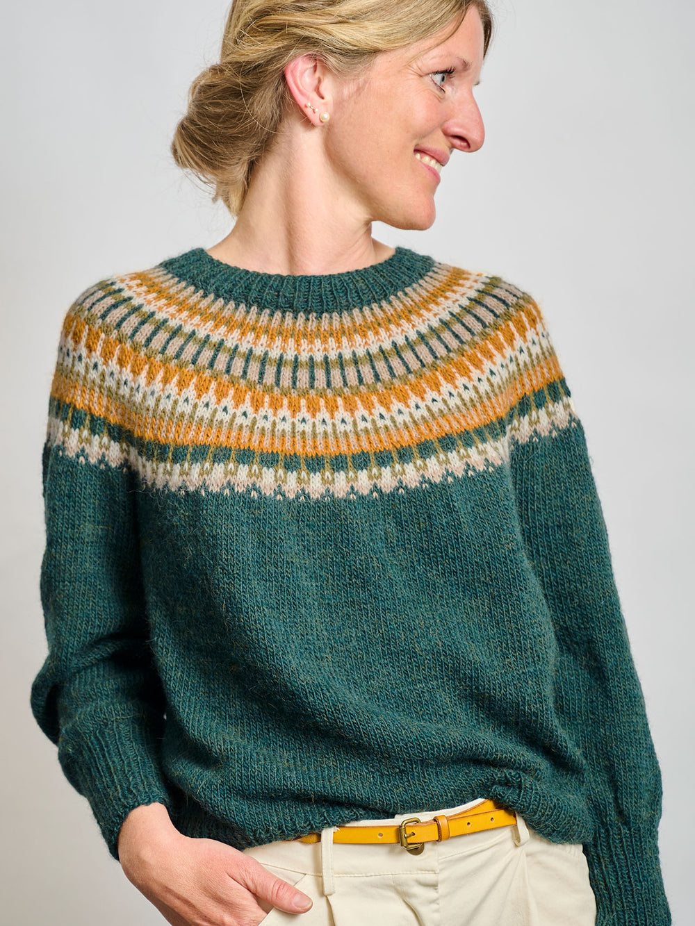 Celeste Sweater från PetiteKnit stickas uppifrån och ner med runt ok i flerfärgsstickning. Tröjan stickas i slätstickning och avslutas med ribbade kanter.