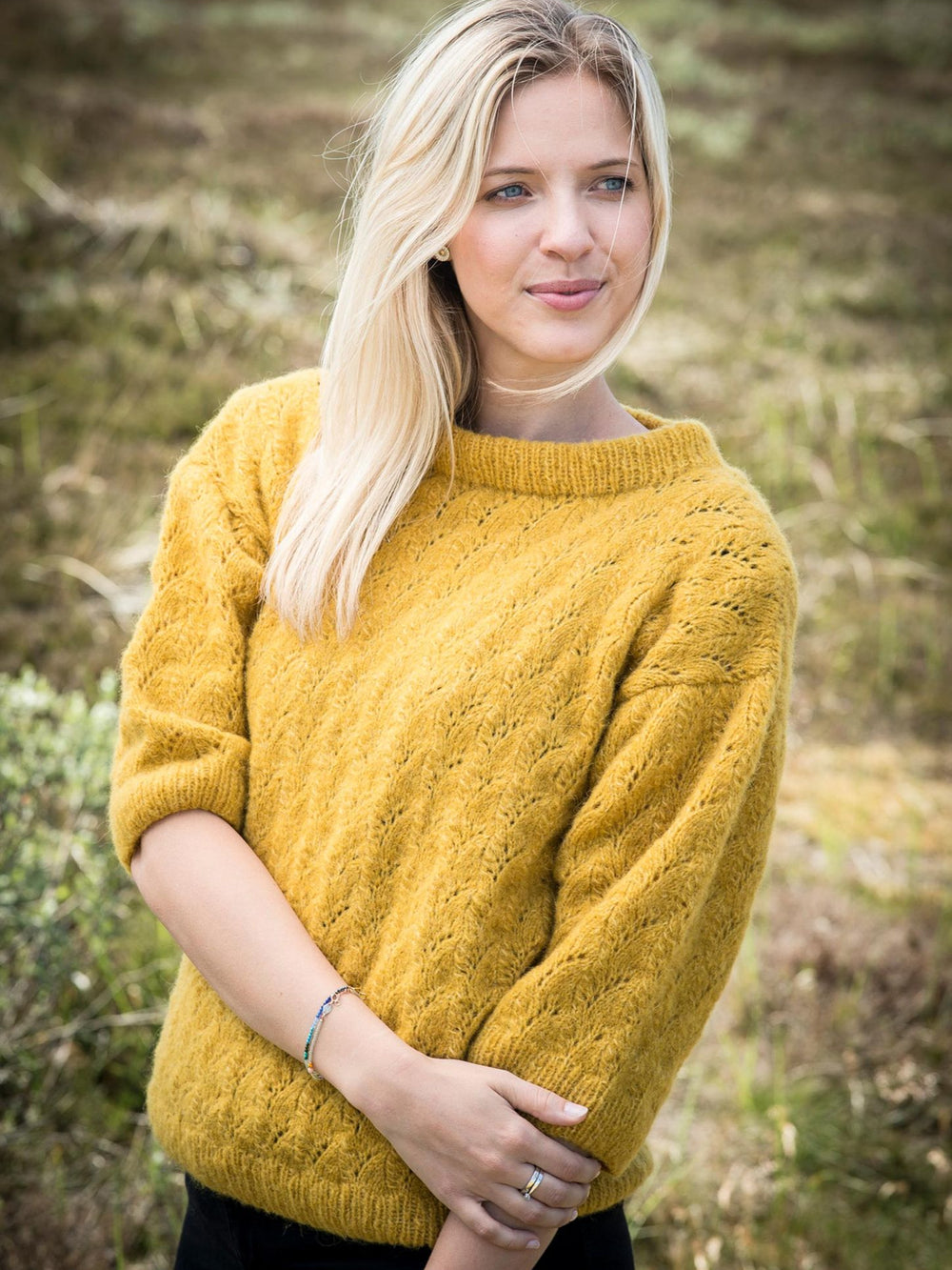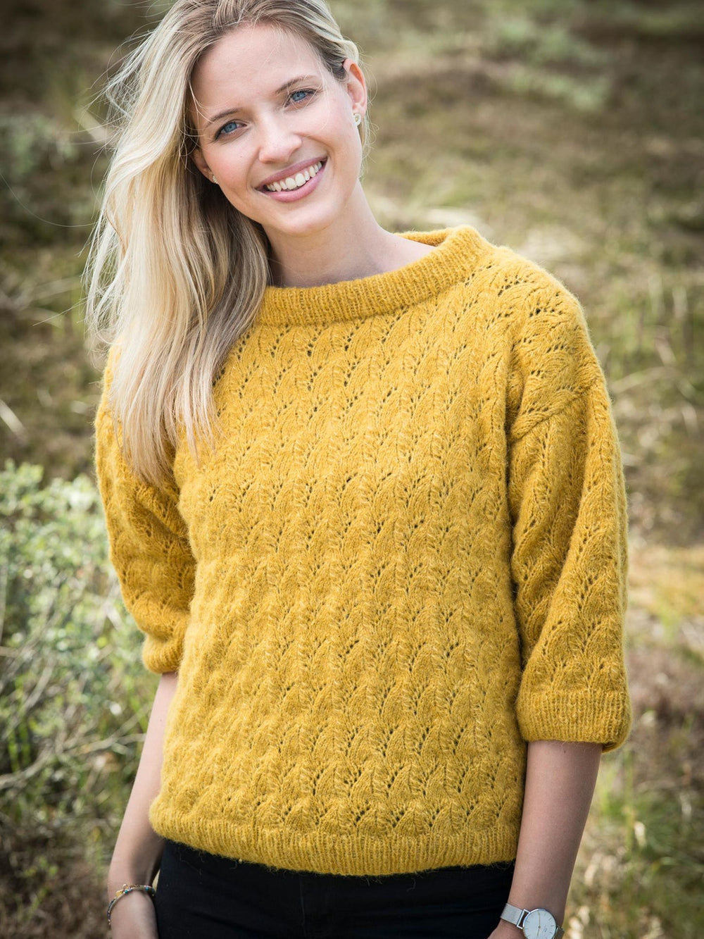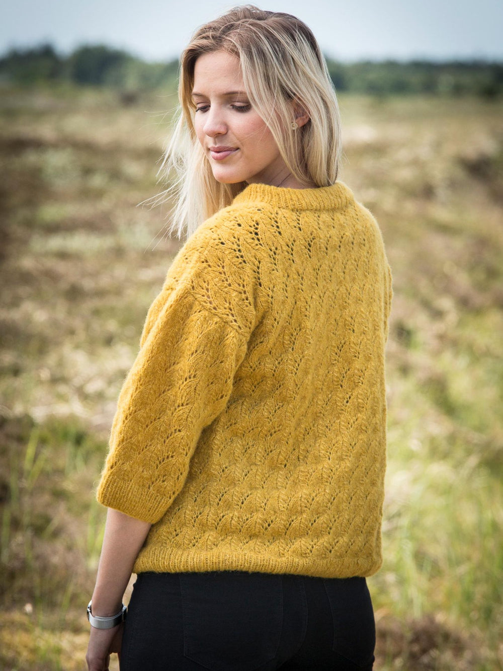 Mycket vacker damtröja stickad i Mayflower New Sky Light, som är en blandning av ull, alpacka och polyamid. Den vackra tröjan är stickad med ett mycket feminint hålmönster och har vackra detaljer med vid halsringning och trekvartärmar med en liten ribbad kant.