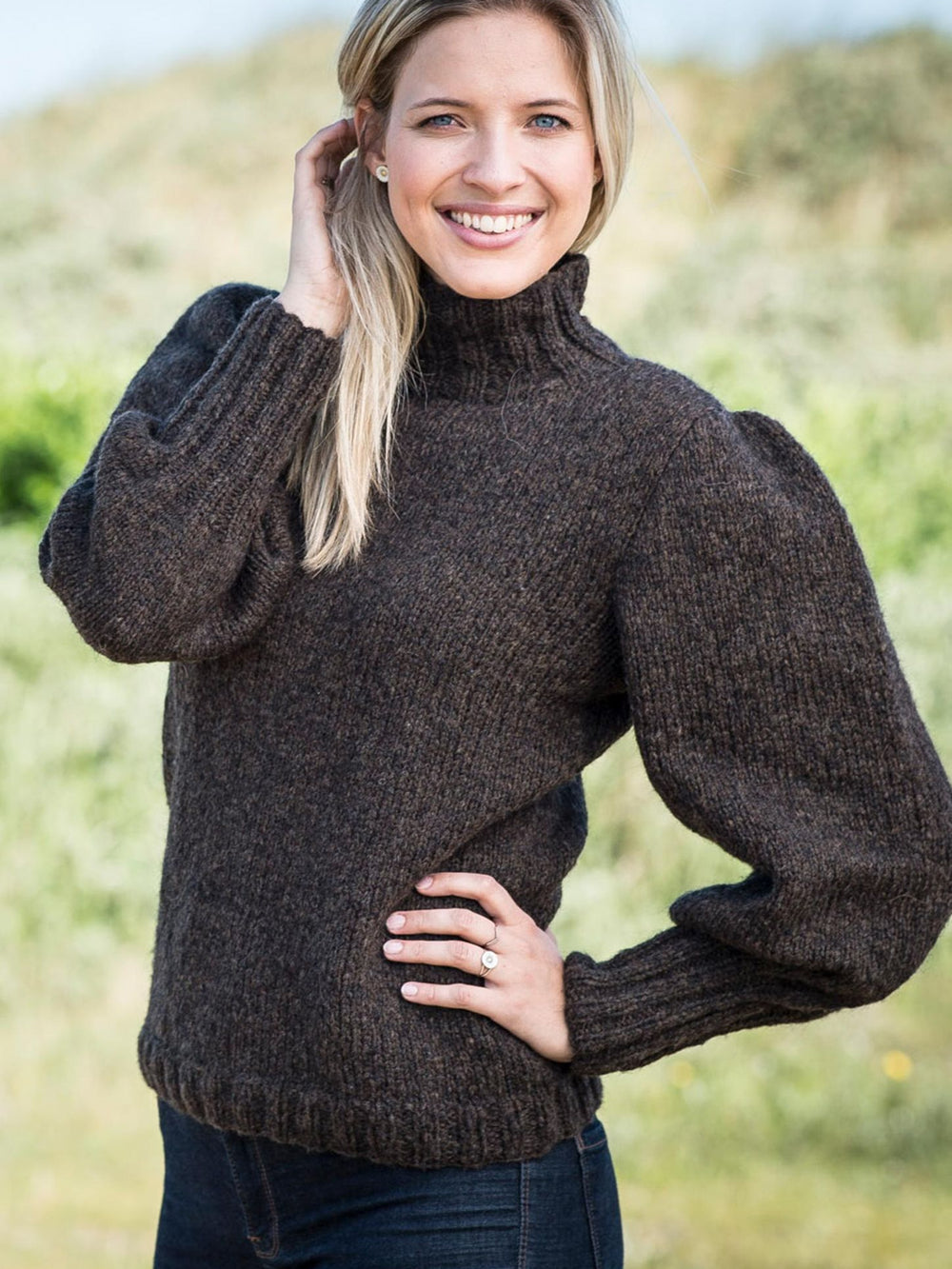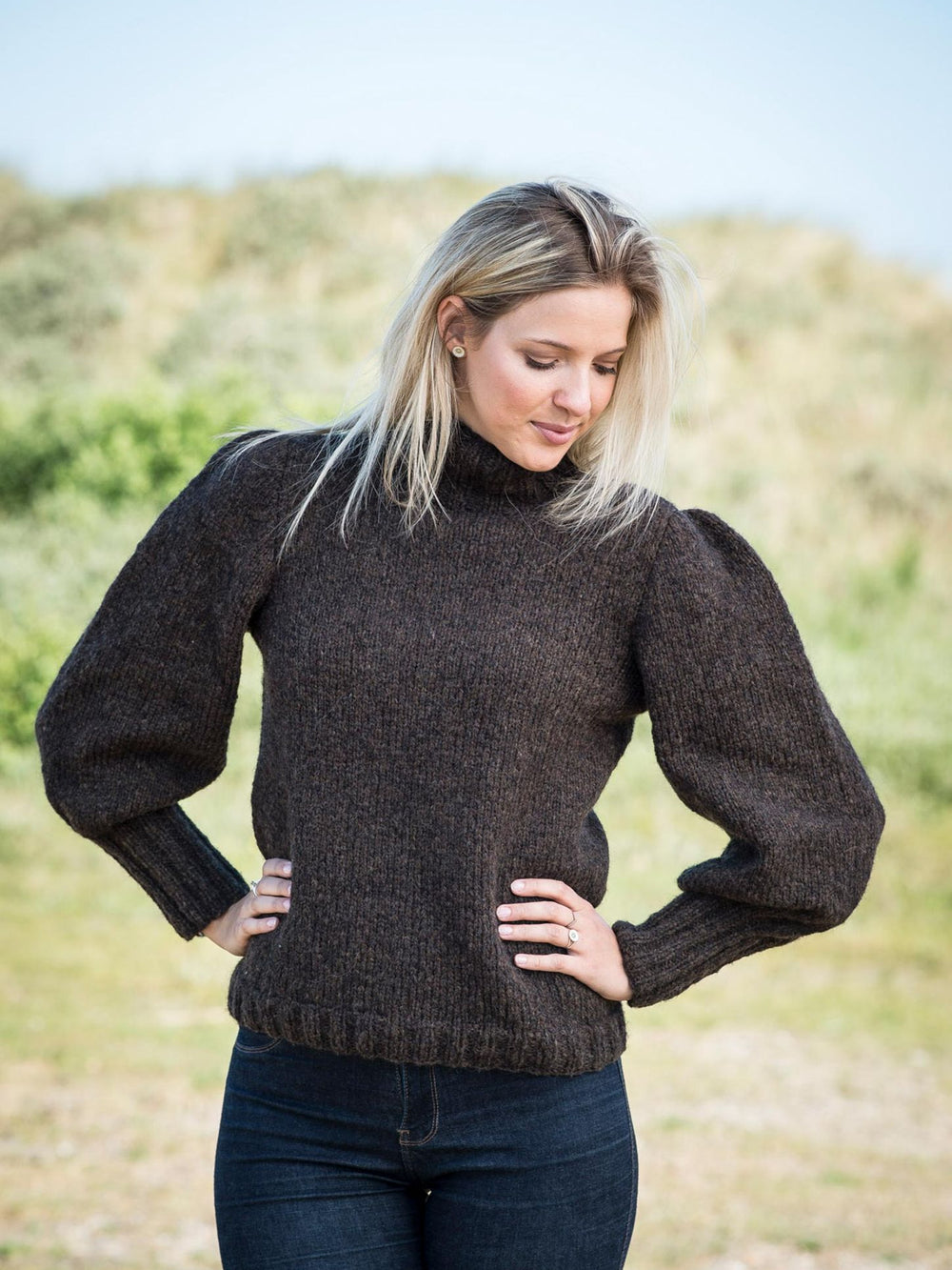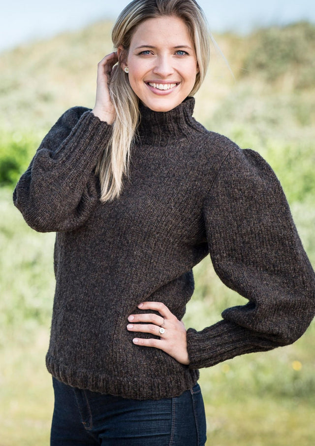 Denna feminina top är ursprungligen stickad i Mayflower New Sky, som var en av Mayflowers mest populära garnkvaliteter. Vi har ersatt New Sky med Santiago, som har samma fiberinnehåll och uttryck. Toppen utmärker sig särskilt genom sina vackra puffärmar, som ger plagget extra elegans och gör det unikt bland många andra stickmönster.