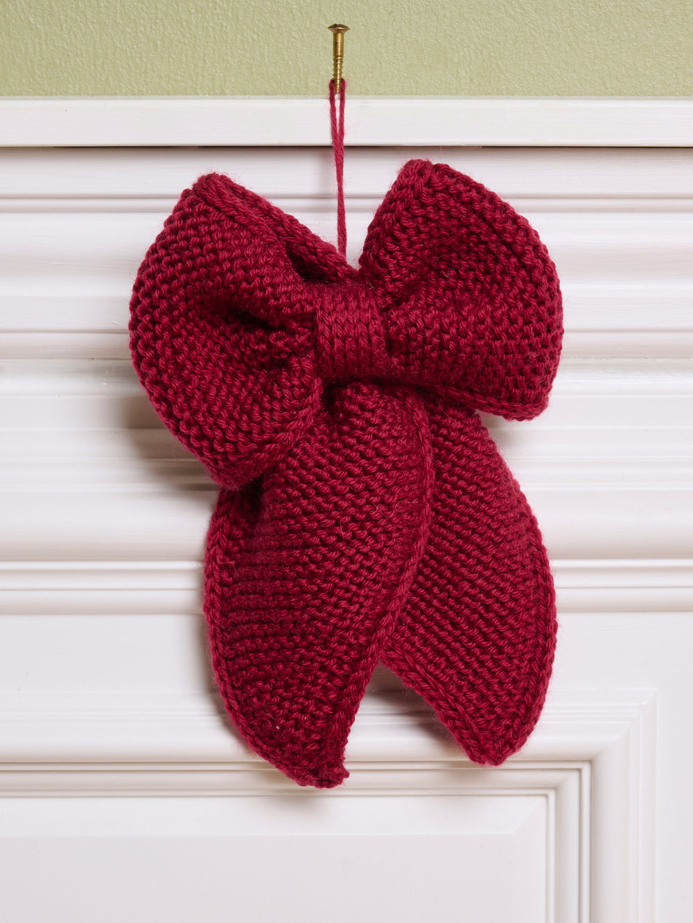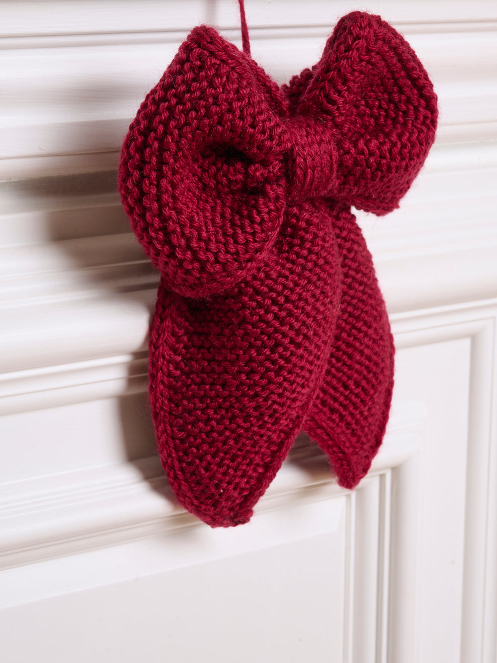 Julrosetten stickas fram och tillbaka i rätstickning från spets till spets, och sidorna stickas med i-cordkant. Därefter viks den till en rosett och sys ihop. Fäst ett snöre eller liknande på baksidan så att rosetten kan hängas upp.