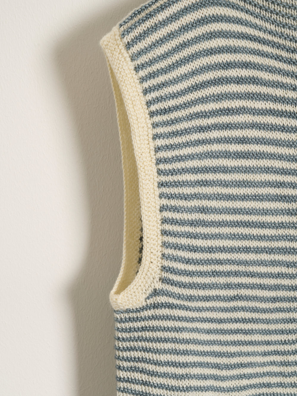 Västen är stickad nerifrån och upp i ett randigt mönster som skapar en 3D-effekt. Västen stickas i ett slätstickningsmönster som bryts av ett avigt varv, vilket ger den vackra effekten. Den randiga effekten framträder tydligast när västen stickas i kontrastfärger.