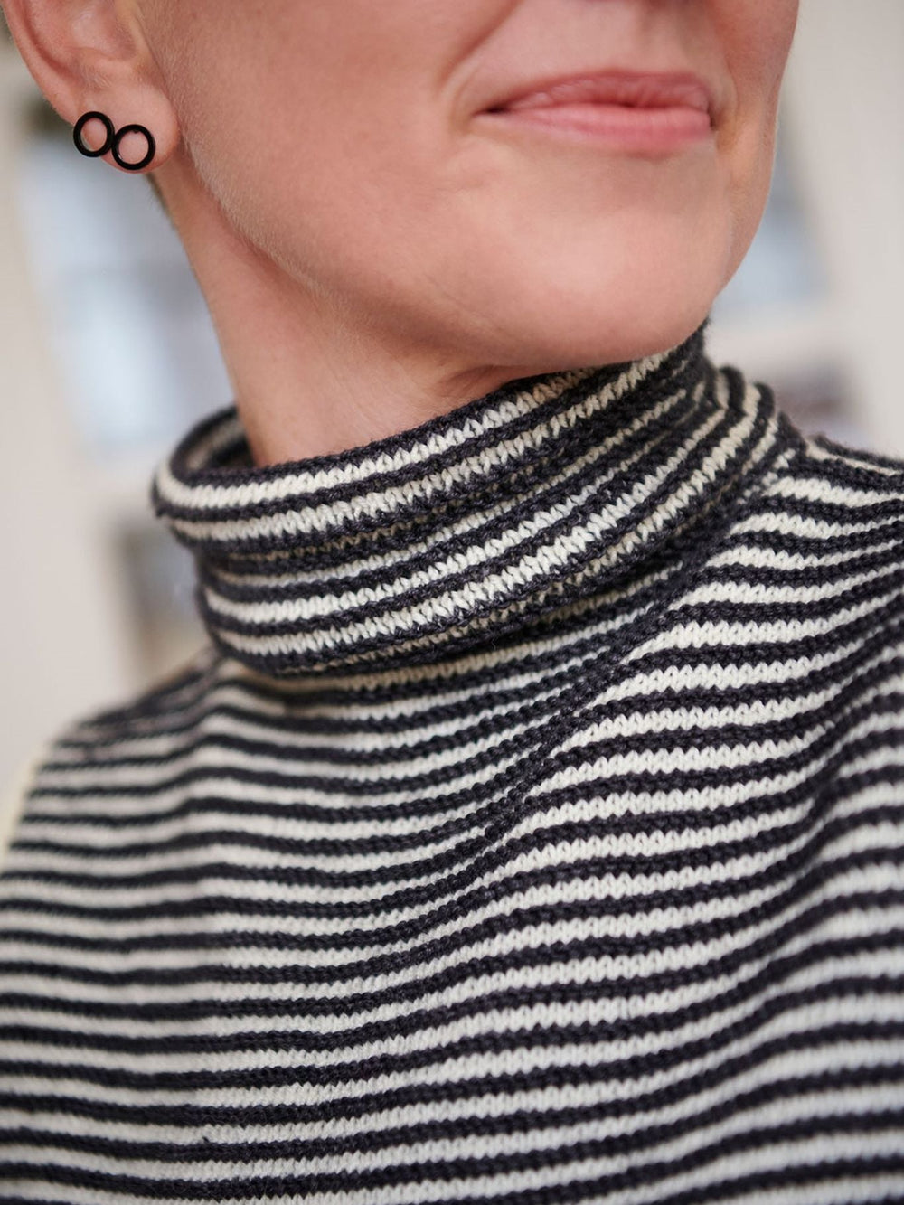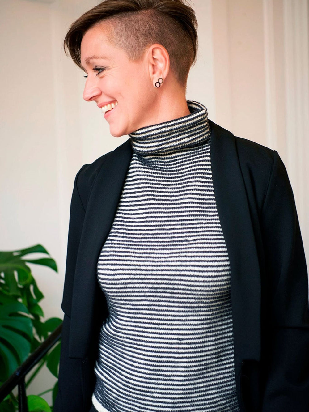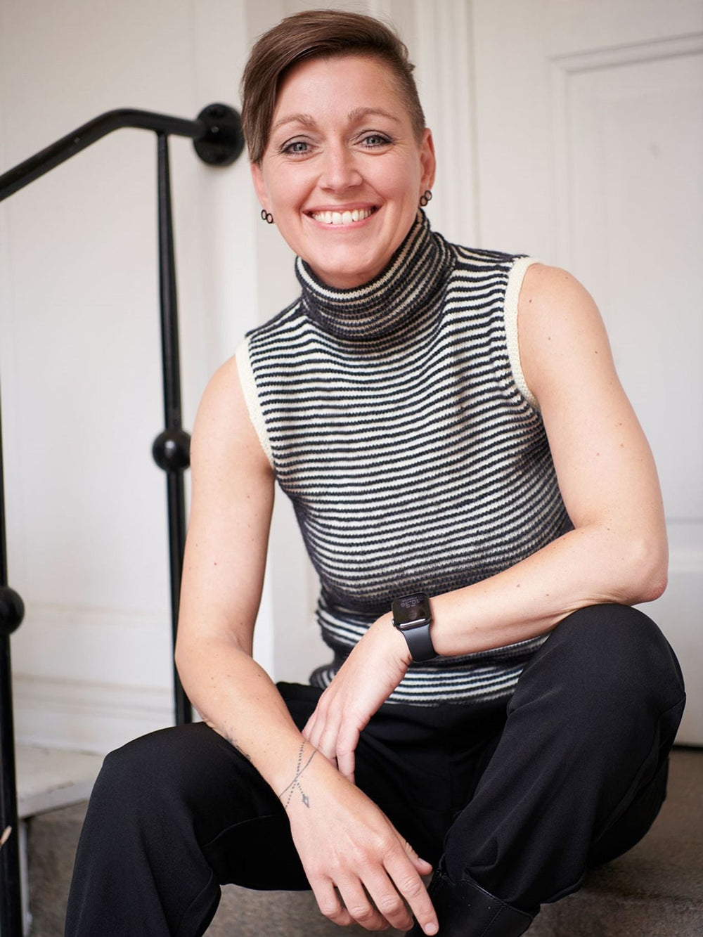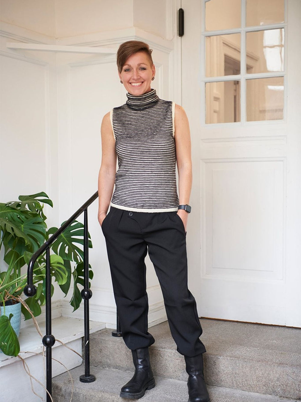 En riktigt fin och fin väst som har ett enkelt uttryck och samtidigt de läckraste detaljerna. Den randiga västen ser bra ut på egen hand, och den är också bra att para ihop med en kavaj, till exempel, och turtleneck ger västen mer karaktär.