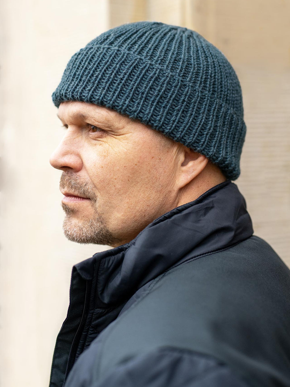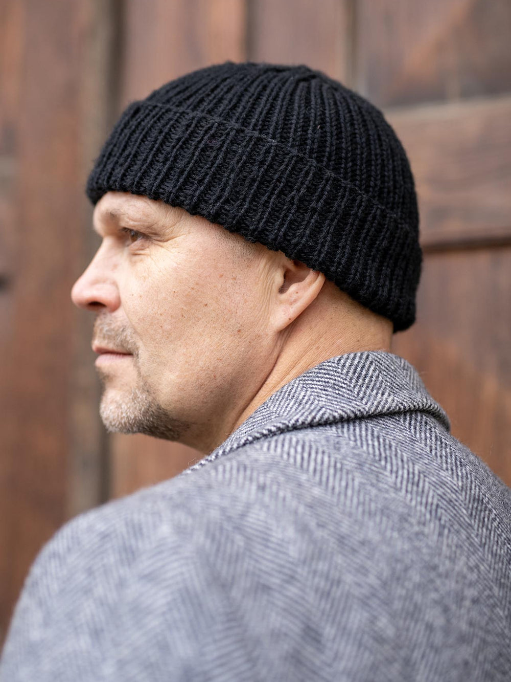 En stilren och tidlös mössa som stickas i resår, nedifrån och upp. Modellen har en bred uppvikt kant och en liten topp, vilket gör att den sitter tätt och bekvämt på huvudet. Perfekt för nybörjare!