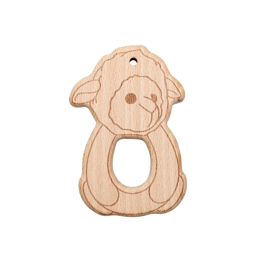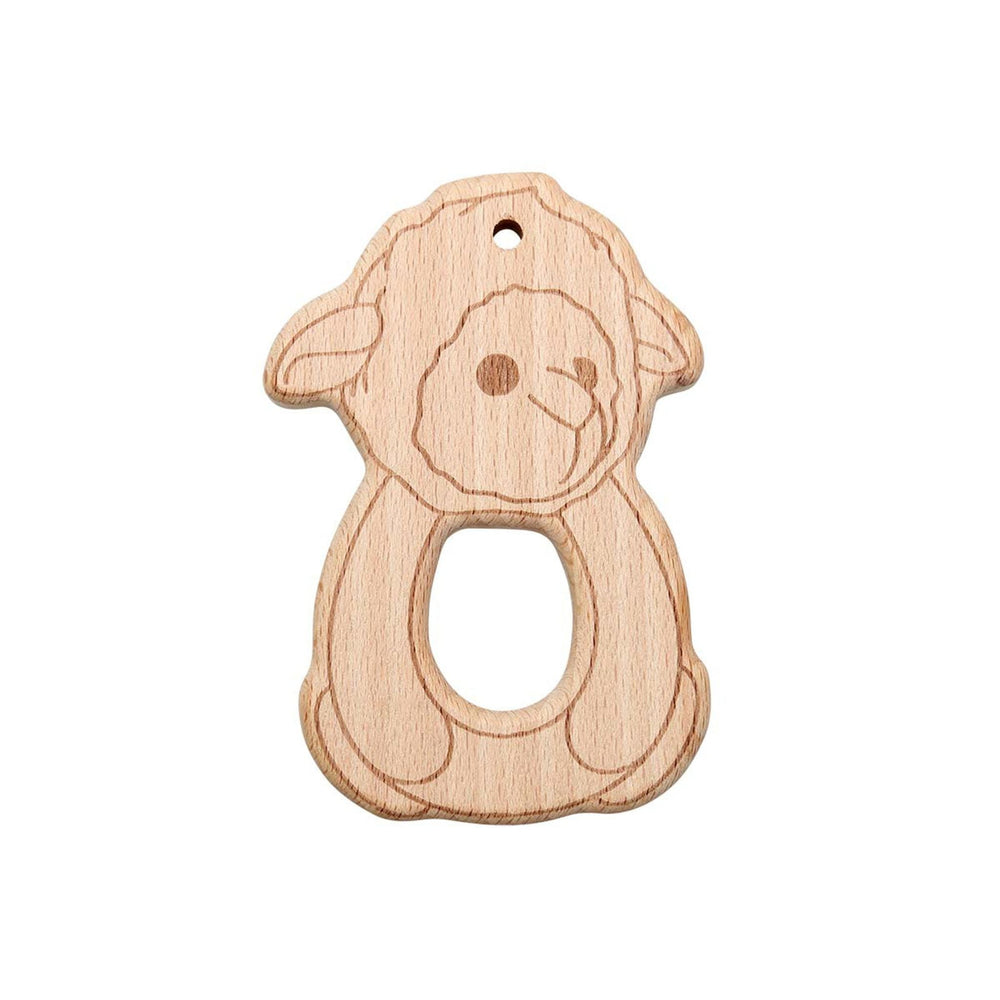 Träfigur formad som ett får, som kan användas till hemmagjorda sensoriska leksaker där den stimulerar som bitring och är lätt för barnet att hålla i.
