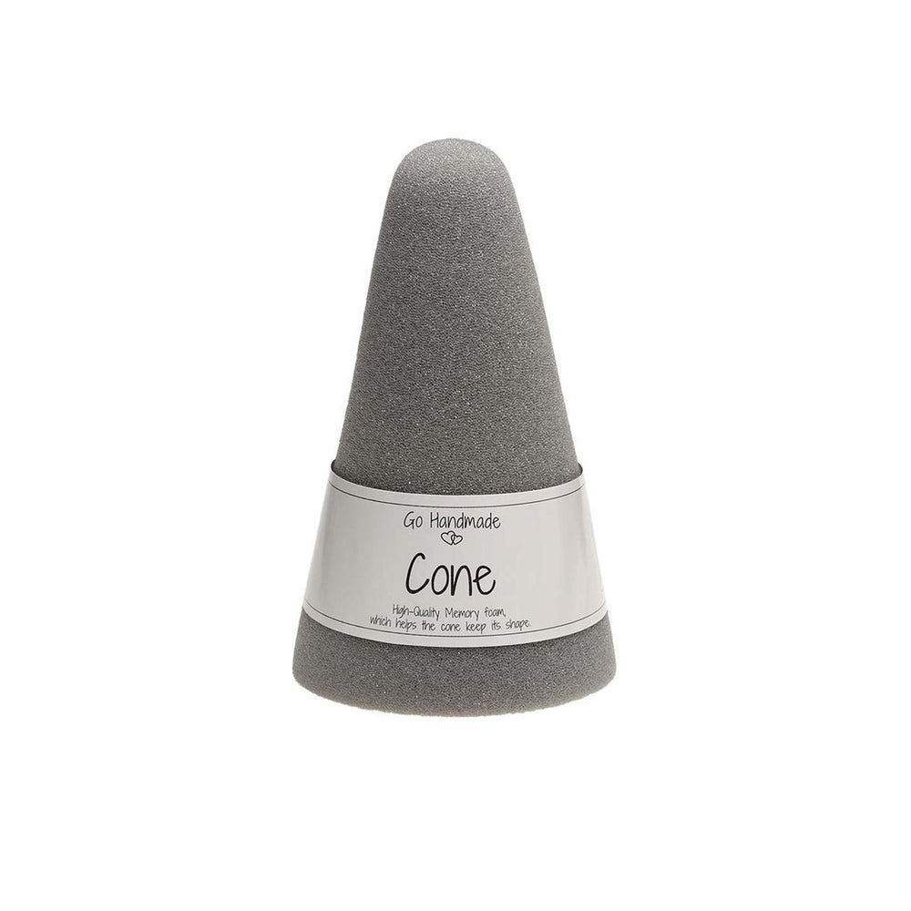 Grå skumkon, storlek 19 x 11 cm, tillverkad av minnesskum. Skumkonan kan användas till virkade leksaker för små barn.