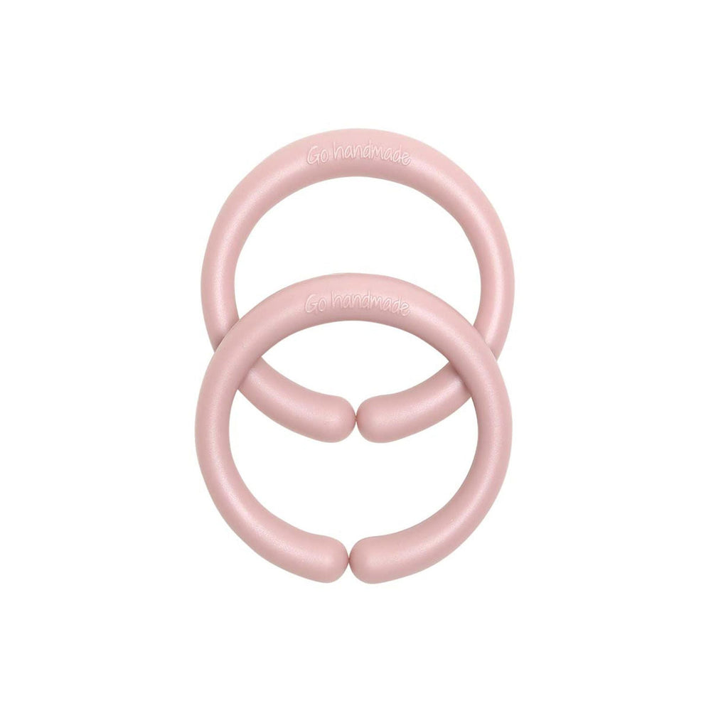 Ringarna är tillverkade av plast i färgen vintage rose och har en diameter på 60 mm. Det finns 2 ringar i påsen. Plasten är hård, vilket innebär att din hängare sitter stadigt fast, men ringen är också lätt att öppna och fästa i t.ex. barnvagnens sufflett.