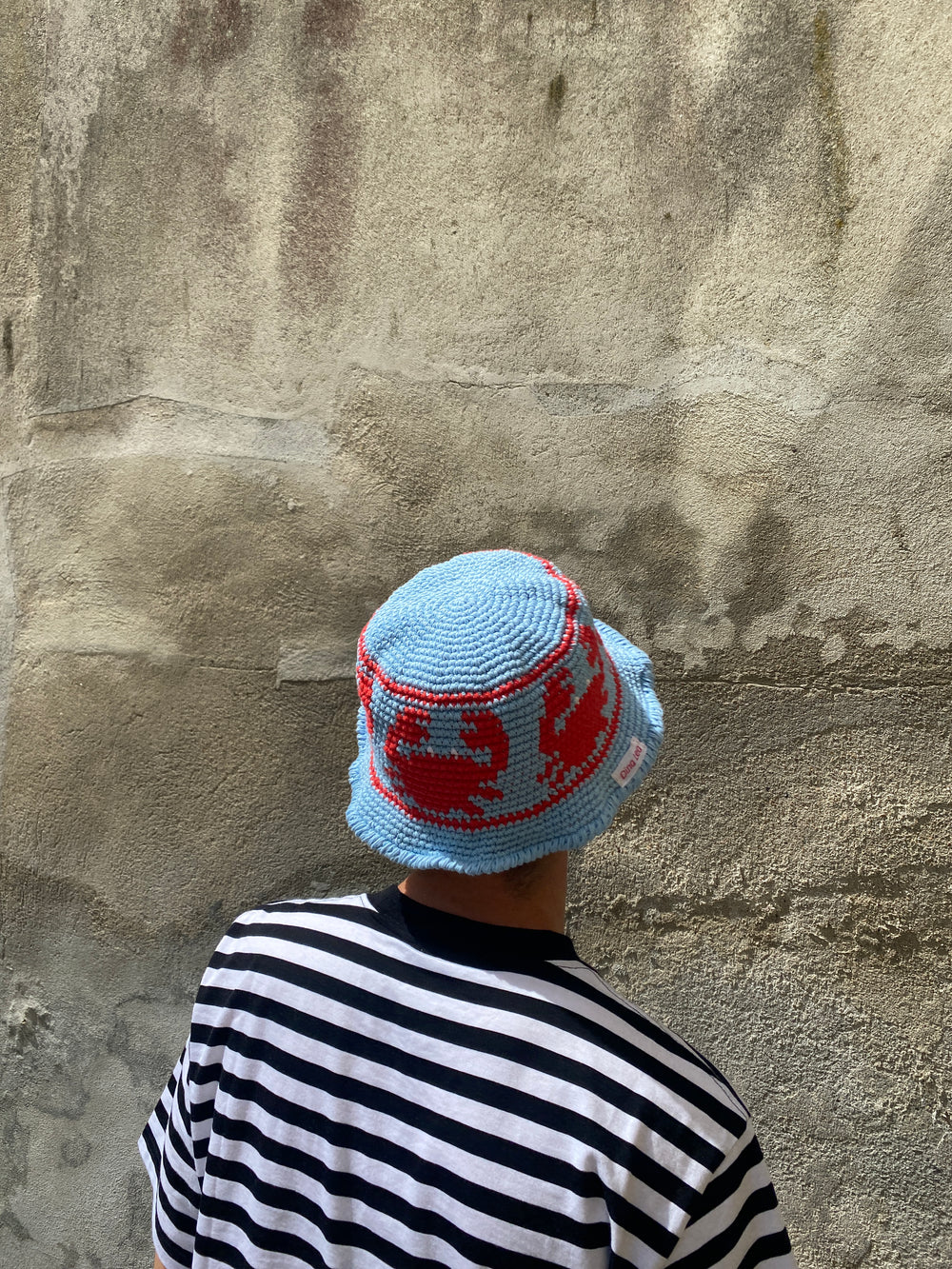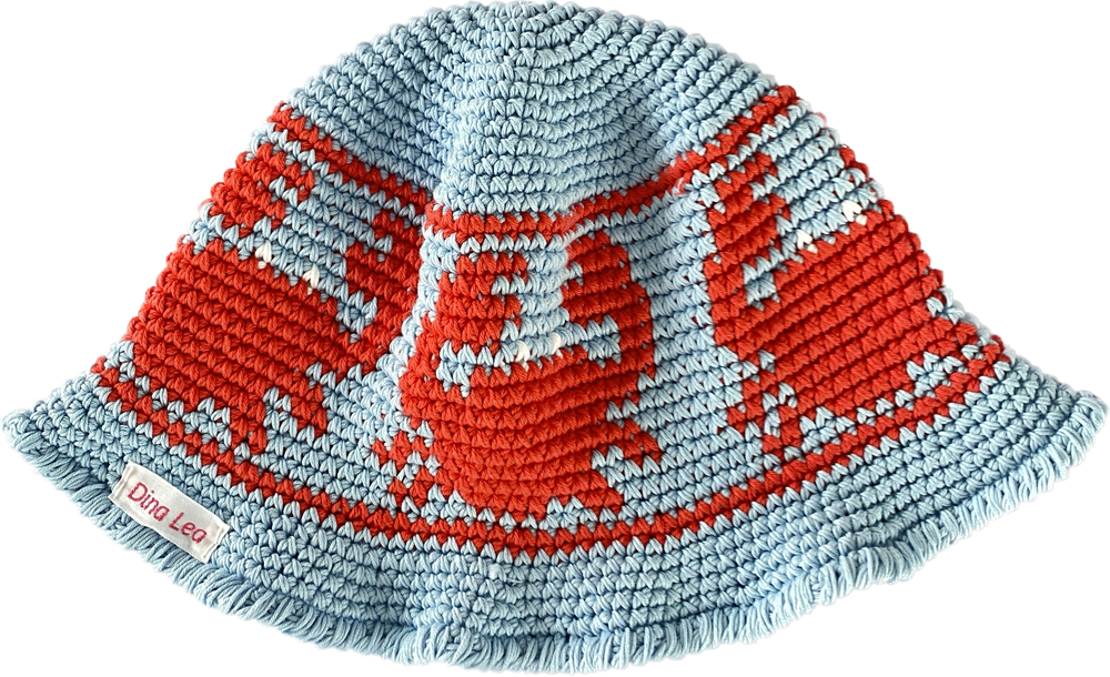 Virkad Bucket Hat (fiskarhatt) med krabbmönster. Detta mönster är Dina Leas "Bucket Hat" design nr. 4