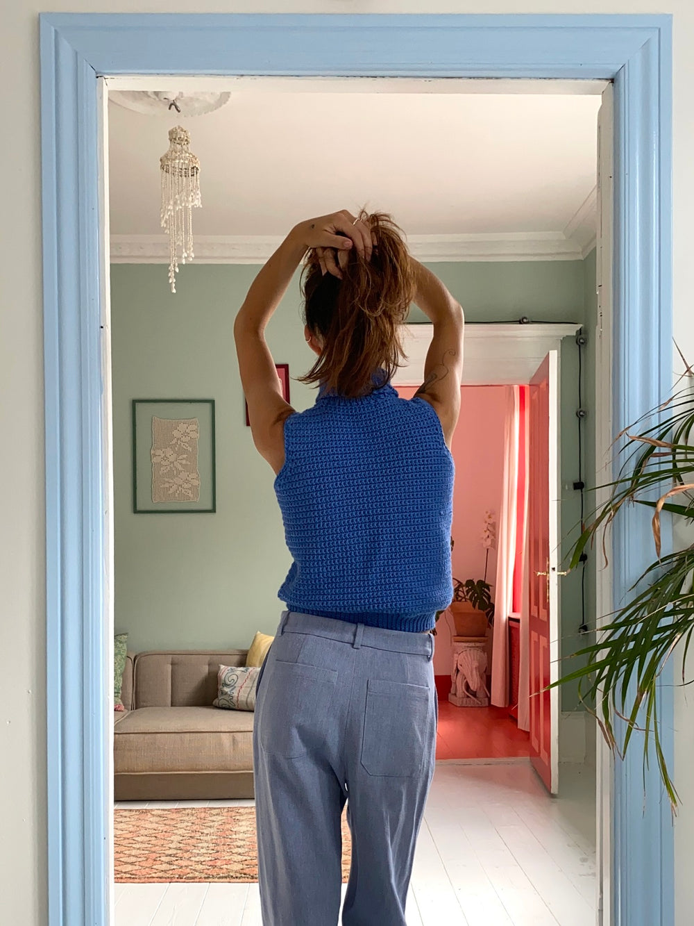 När de två delarna är färdigvirkade, monteras de ihop, och en elegant ribbad polokrage (turtleneck) samt en ribbad kant läggs till, vilket fulländar designen och ger en snygg finish.