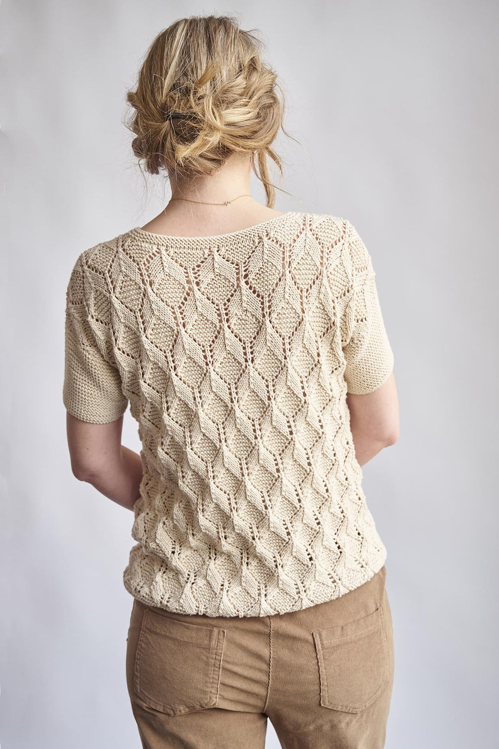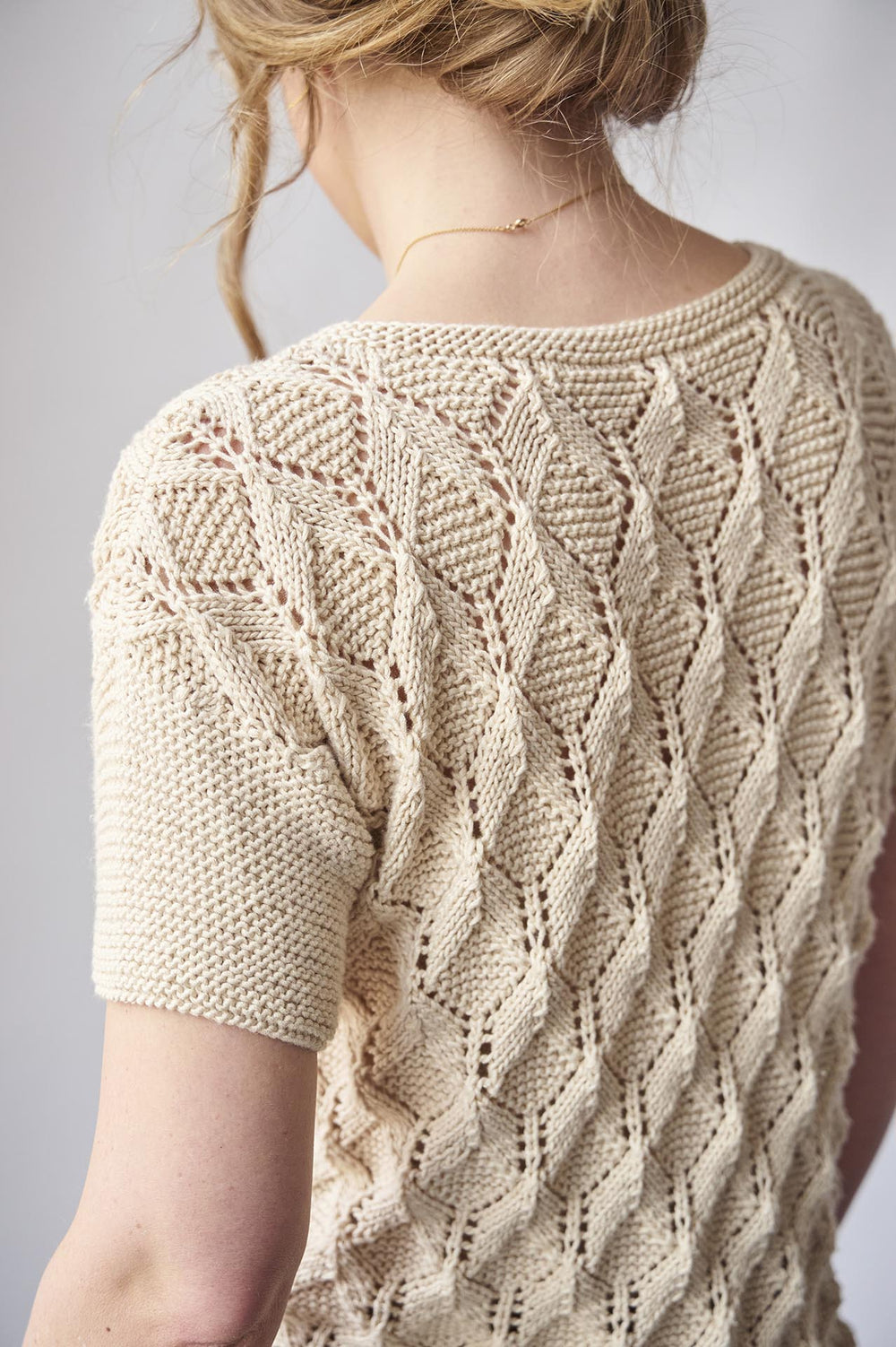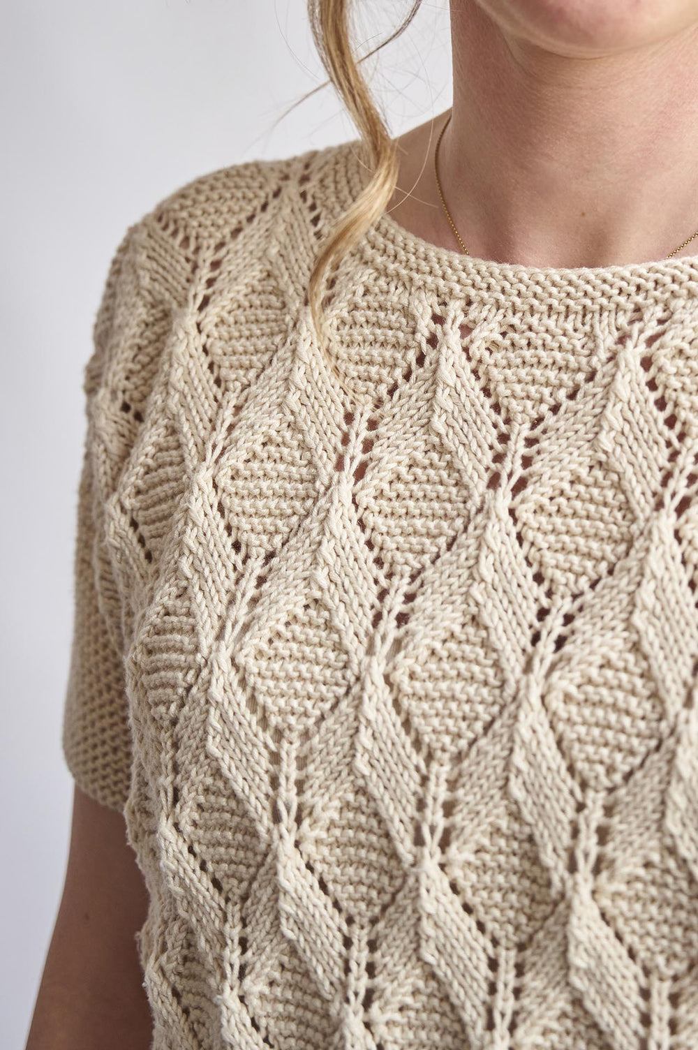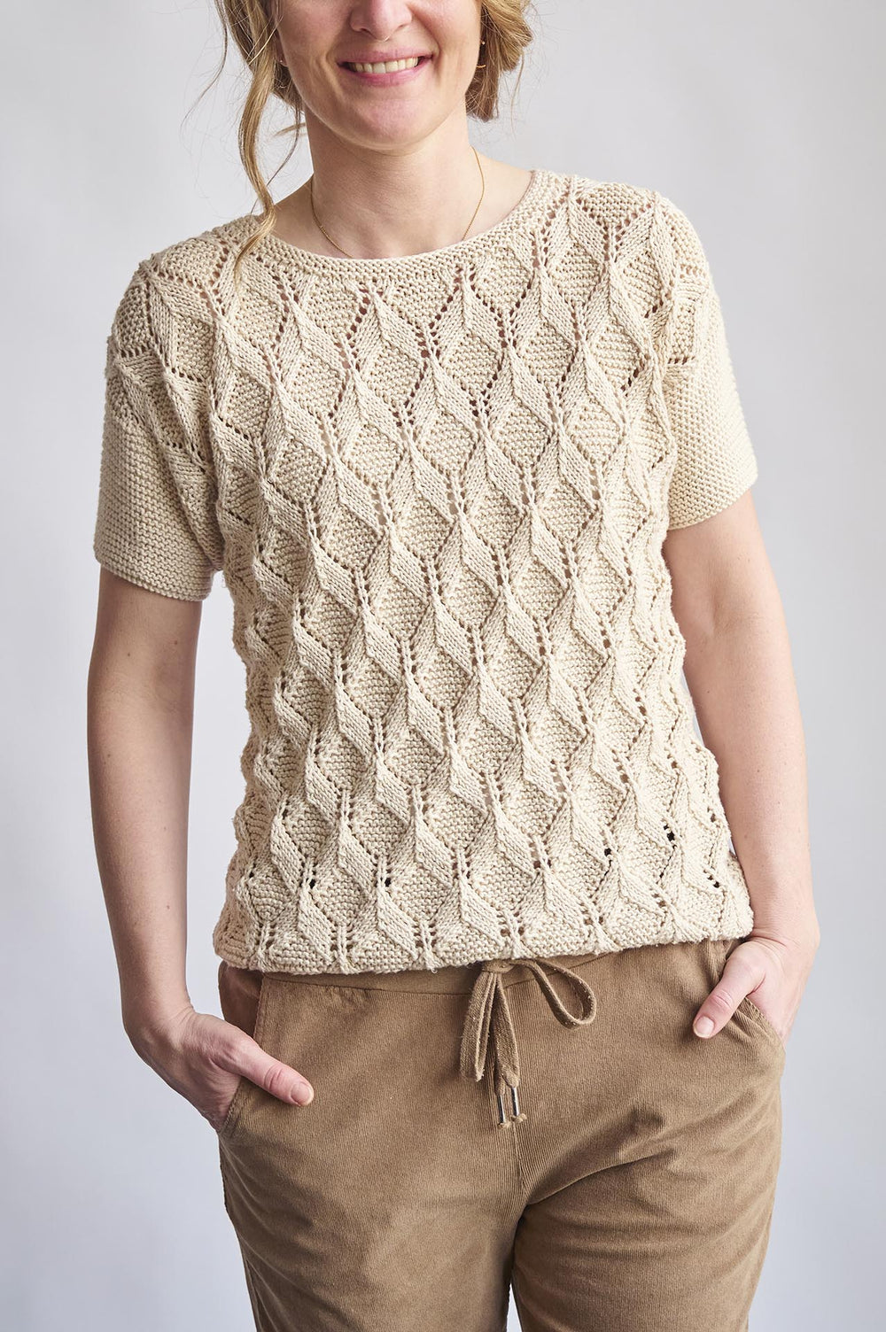 Jette Tee är en skön, kortärmad topp med ett vackert strukturmönster över både fram- och bakstycket – stickat med olika tekniker för ett livfullt uttryck. Ärmarna och kanterna stickas i rätstickning*, vilket ger en fin kontrast. Tröjan stickas runt nerifrån och upp till ärmhålen, där den delas och stickas klart i två delar.