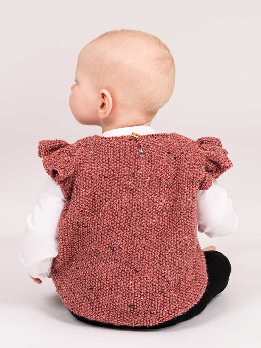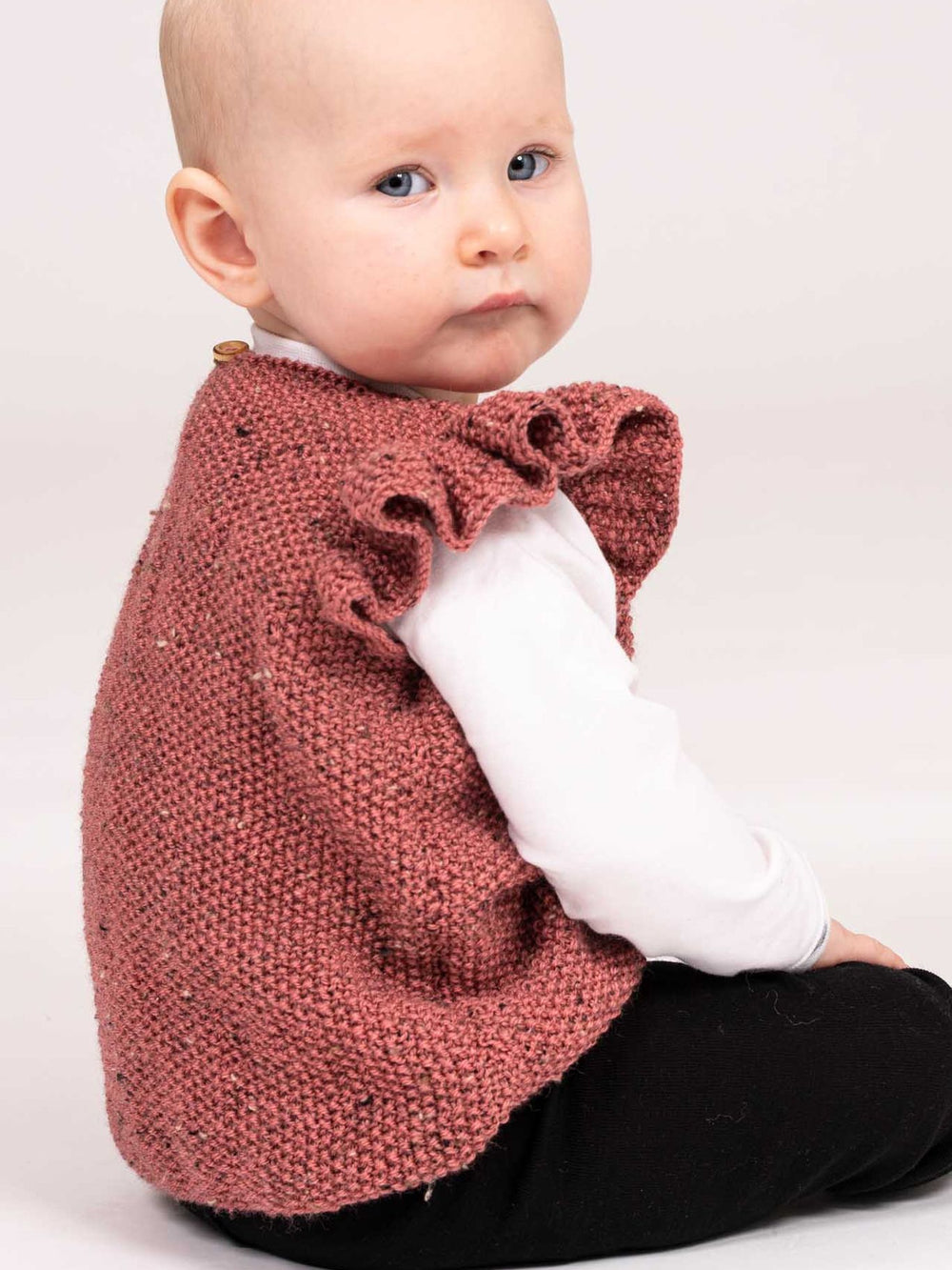 Med sina fylliga volanger på axlarna, det eleganta mönstret av mosstickningen och garnets naturliga färgskiftningar är Blomklocka Väst Mini ett av de mest bedårande plaggen för en liten flicka.