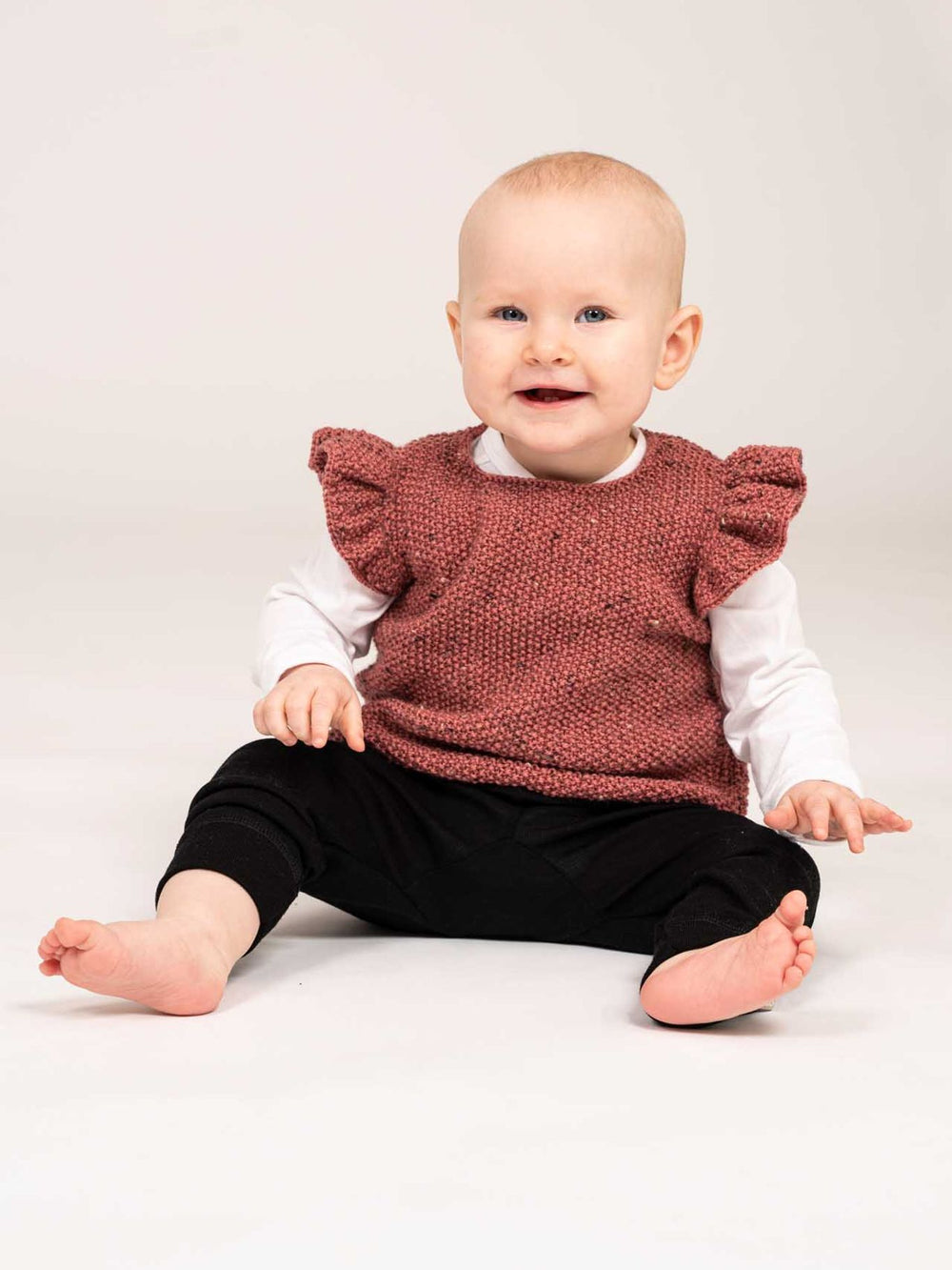 Västen är stickad i det mjuka och behagliga ullgarnet Mayflower Easy Care Tweed. Garnet är känt för sin mjukhet, vilket gör det perfekt för barnkläder som denna väst, som blir både superbekväm och luftig. De karakteristiska tweednistorna i viskos ger västen ett vackert, melerat utseende.