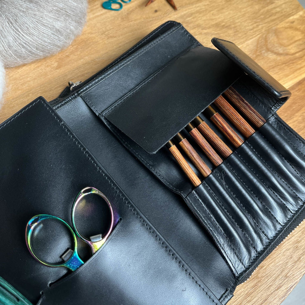 Ett exklusivt och stilrent fodral i äkta läder, där både design och funktion har prioriterats. Förutom att erbjuda elegant förvaring för dina utbytbara rundstickor och sticktillbehör är fodralet rymligt, praktiskt och lätt att ta med på språng.