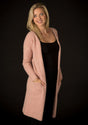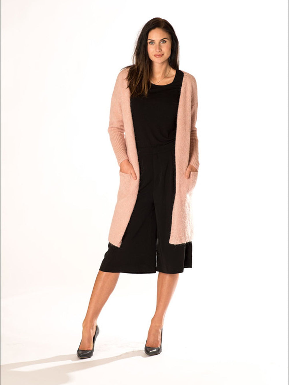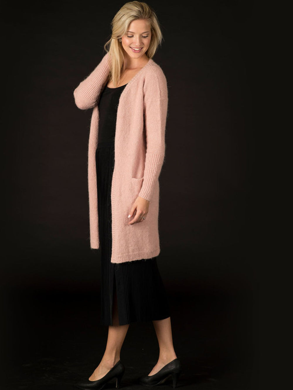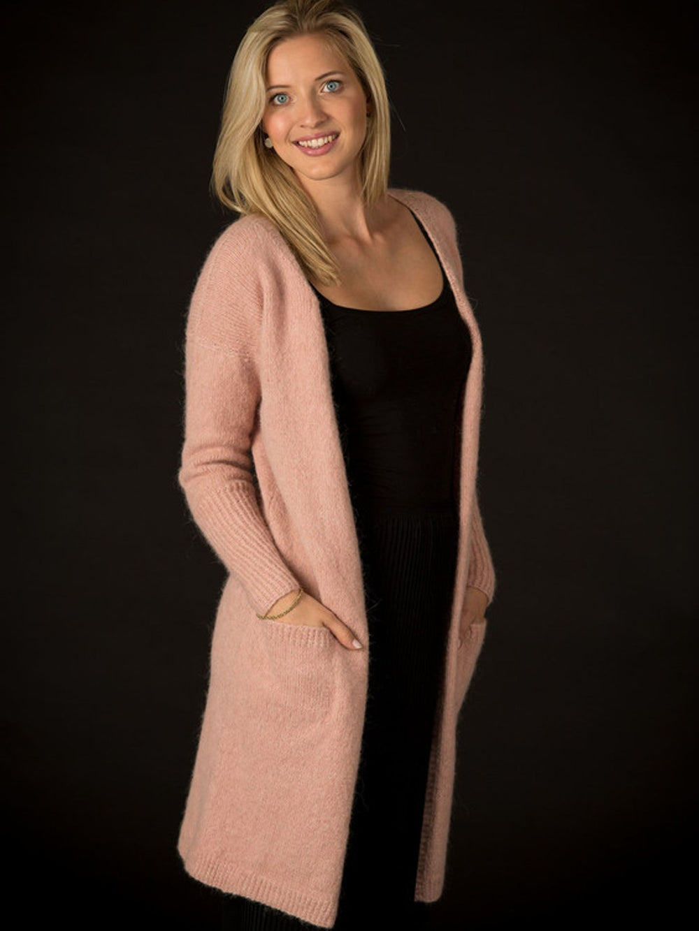 Lång och varm cardigan med breda resårkanter på ärmarna och invändiga fickor.