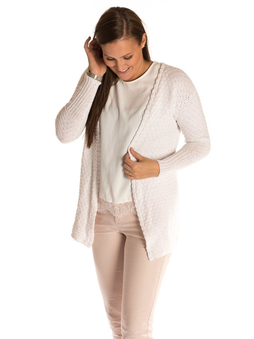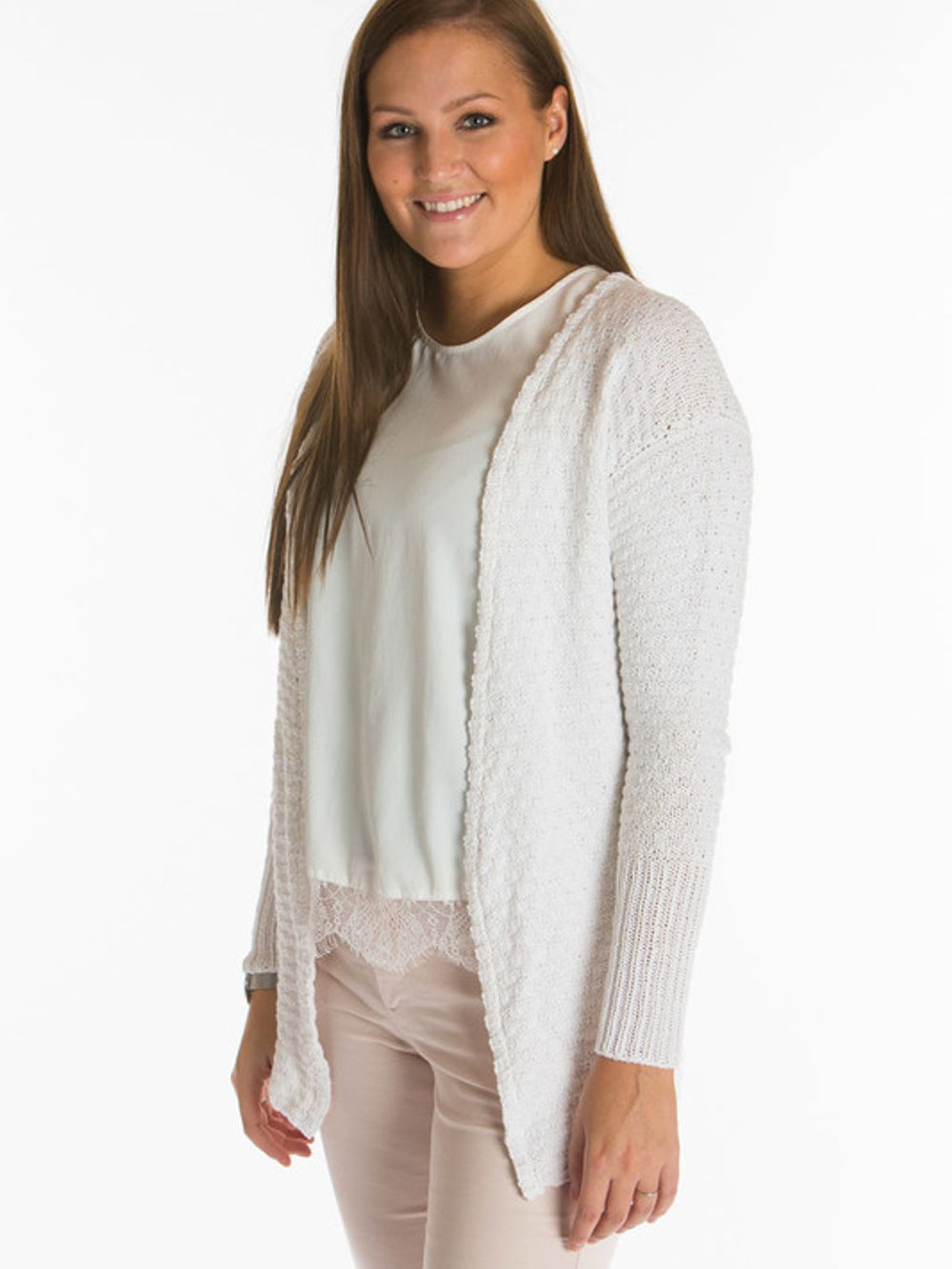 Denna vackra kofta har ett enkelt våffelmönster som ger koftans stickning en fin struktur.