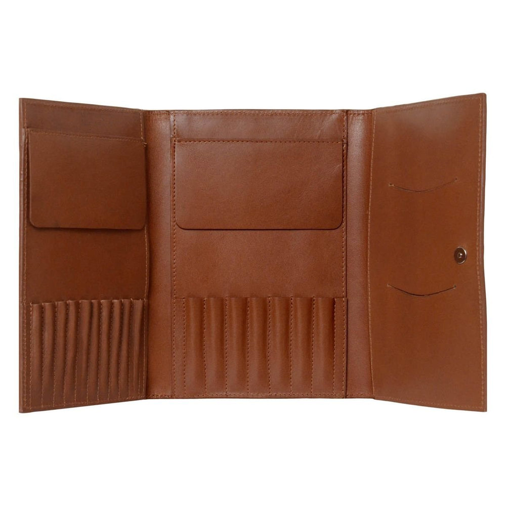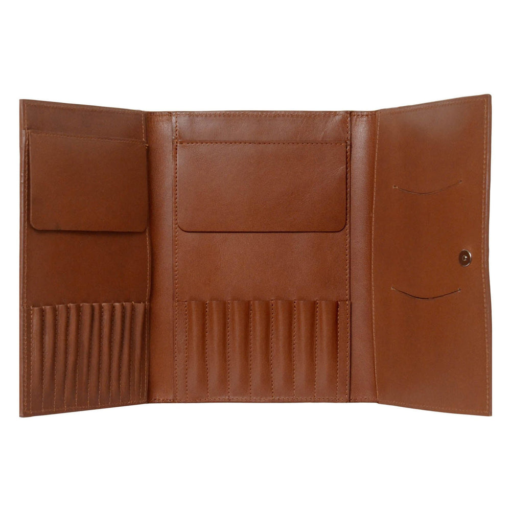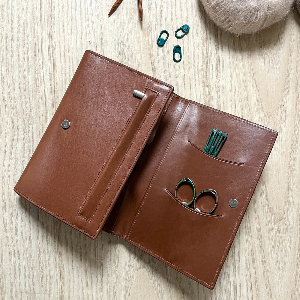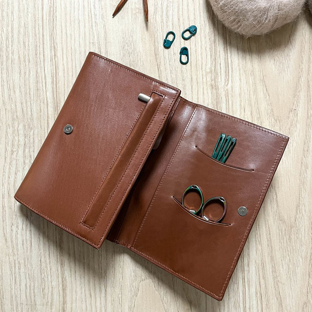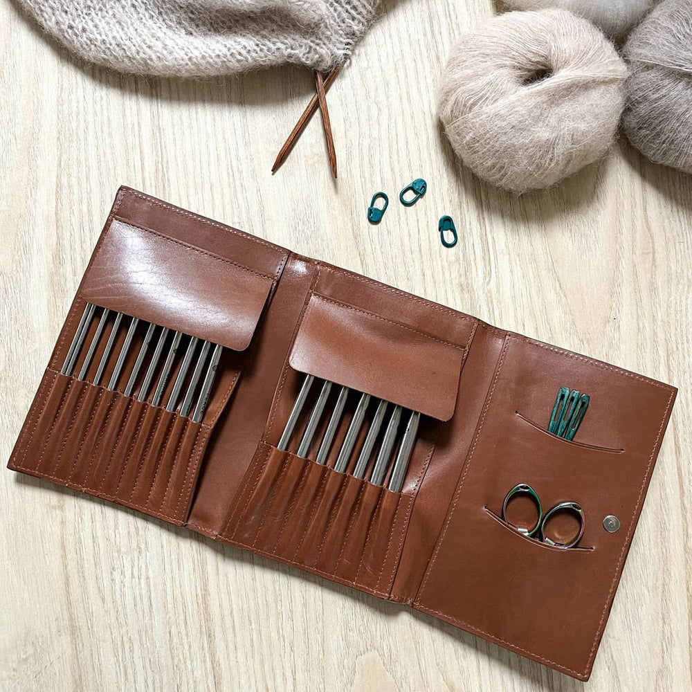 Tänk på att lädret kan kännas stramt i de sydda fickorna för stickor när fodralet är nytt. Med användning mjuknar lädret och formar sig efter innehållet.