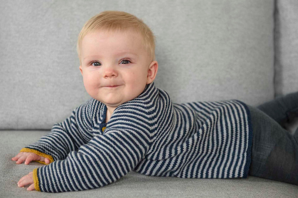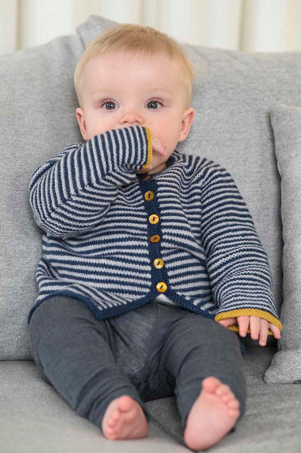 Söt kofta för barn i åldern 0-4 år. Koftan har en enkel design med smala ränder och knappar som inte går hela vägen ner.