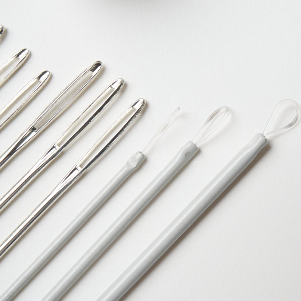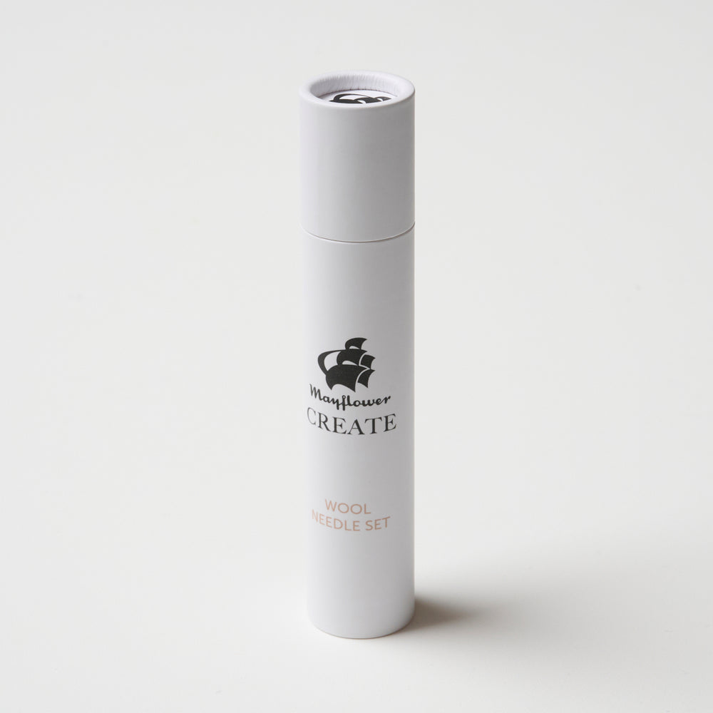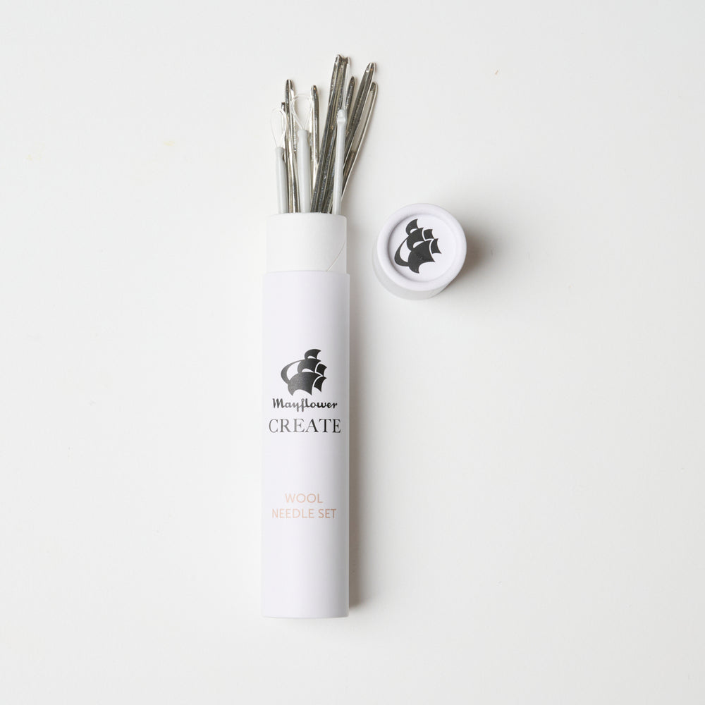 Praktiskt rör med totalt 12 nålar i olika storlekar – både stoppnålar och tjockare ullnålar. Det stadiga pappersröret håller nålarna samlade och skyddade. Nålarna är mellan 5 och 9 cm långa.