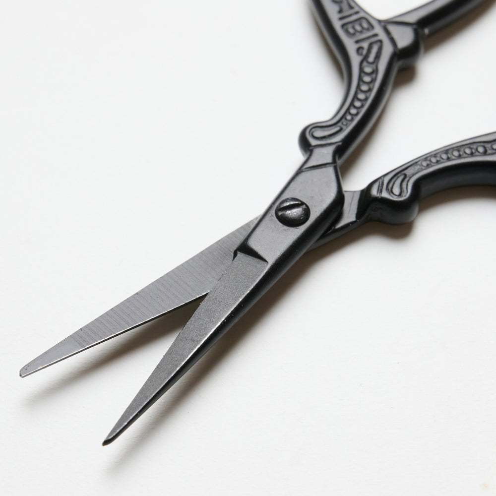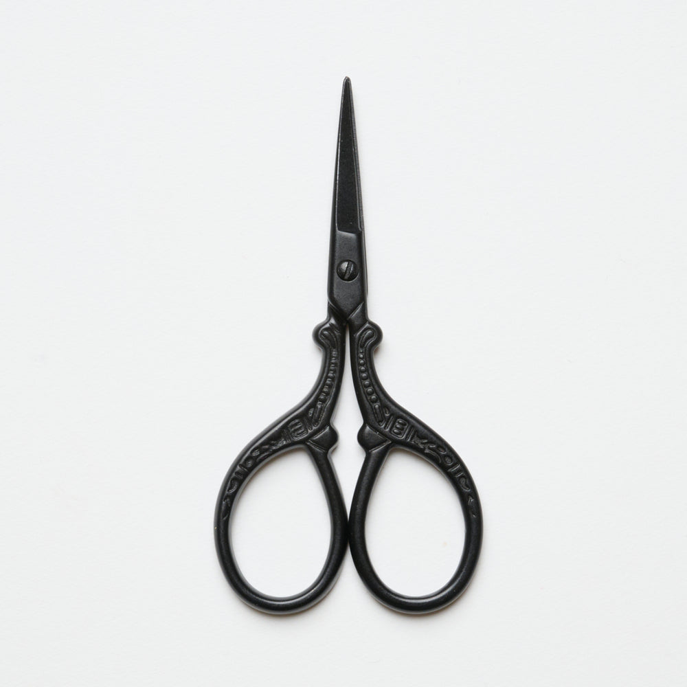 En fin liten sax som är praktisk att ha nära till hands. Med en längd på bara 9 cm ger den korta saxen mer precision än en större sax. Den svarta saxen har vackra ornament på sidorna.