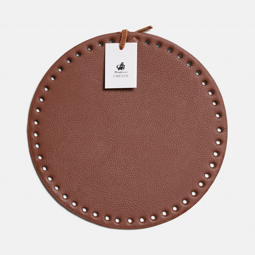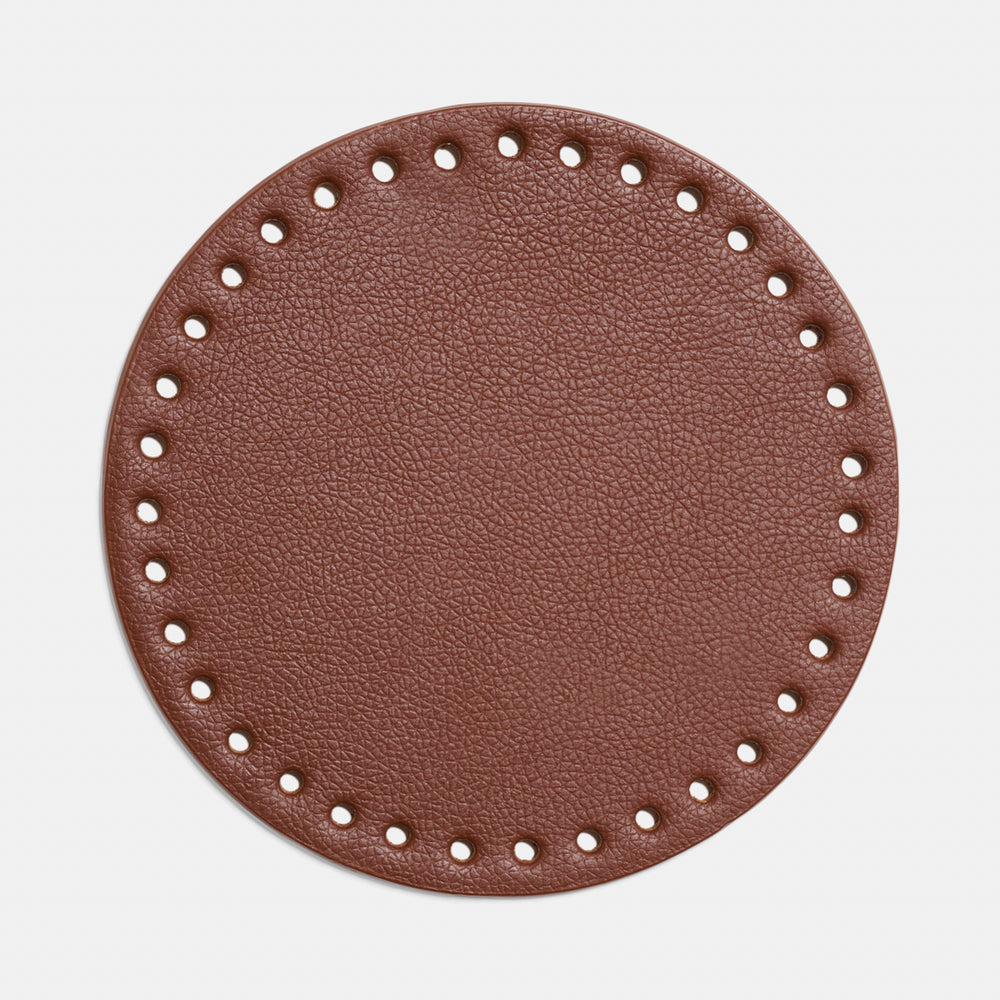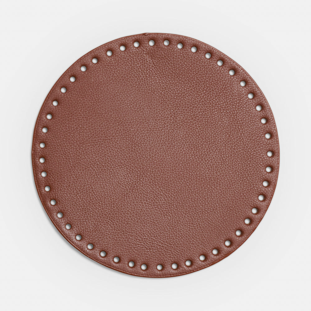 Rund læderbund, som er lavet i ægte læder. Læderbunden er håndlavet med huller på 5 mm rundt langs kanten og kan bruges som bund i fx en hæklet kurv eller taske. Læderbunden har en tykkelse på 3,5-4 mm.