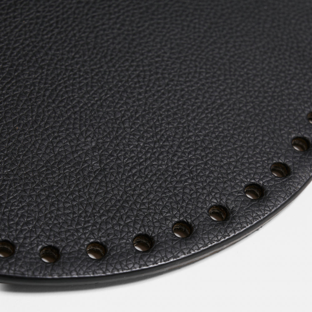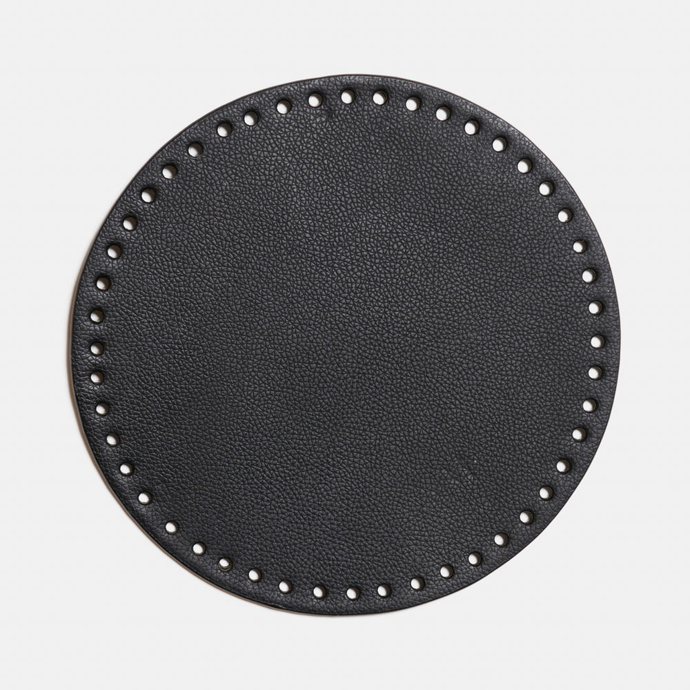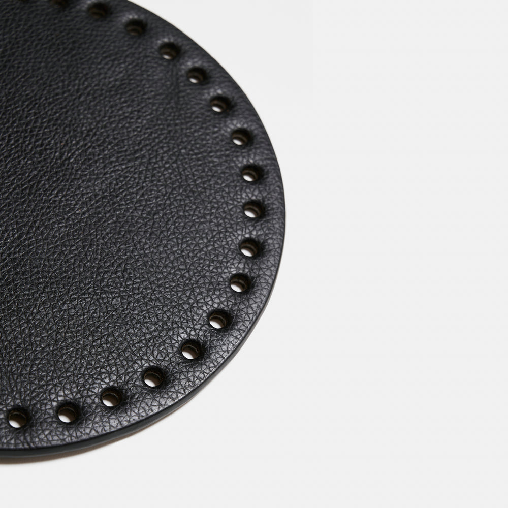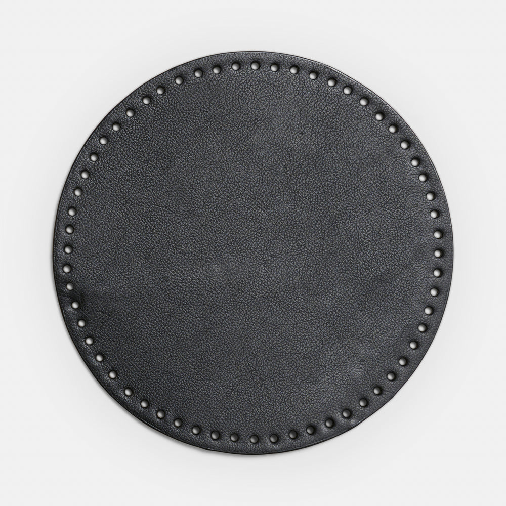 Rund læderbund, som er lavet i ægte læder. Læderbunden er håndlavet med huller på 5 mm rundt langs kanten og kan bruges som bund i fx en hæklet kurv eller taske. Læderbunden har en tykkelse på 3,5-4 mm.