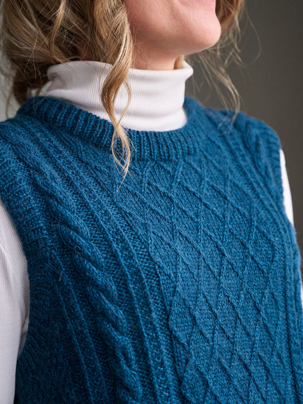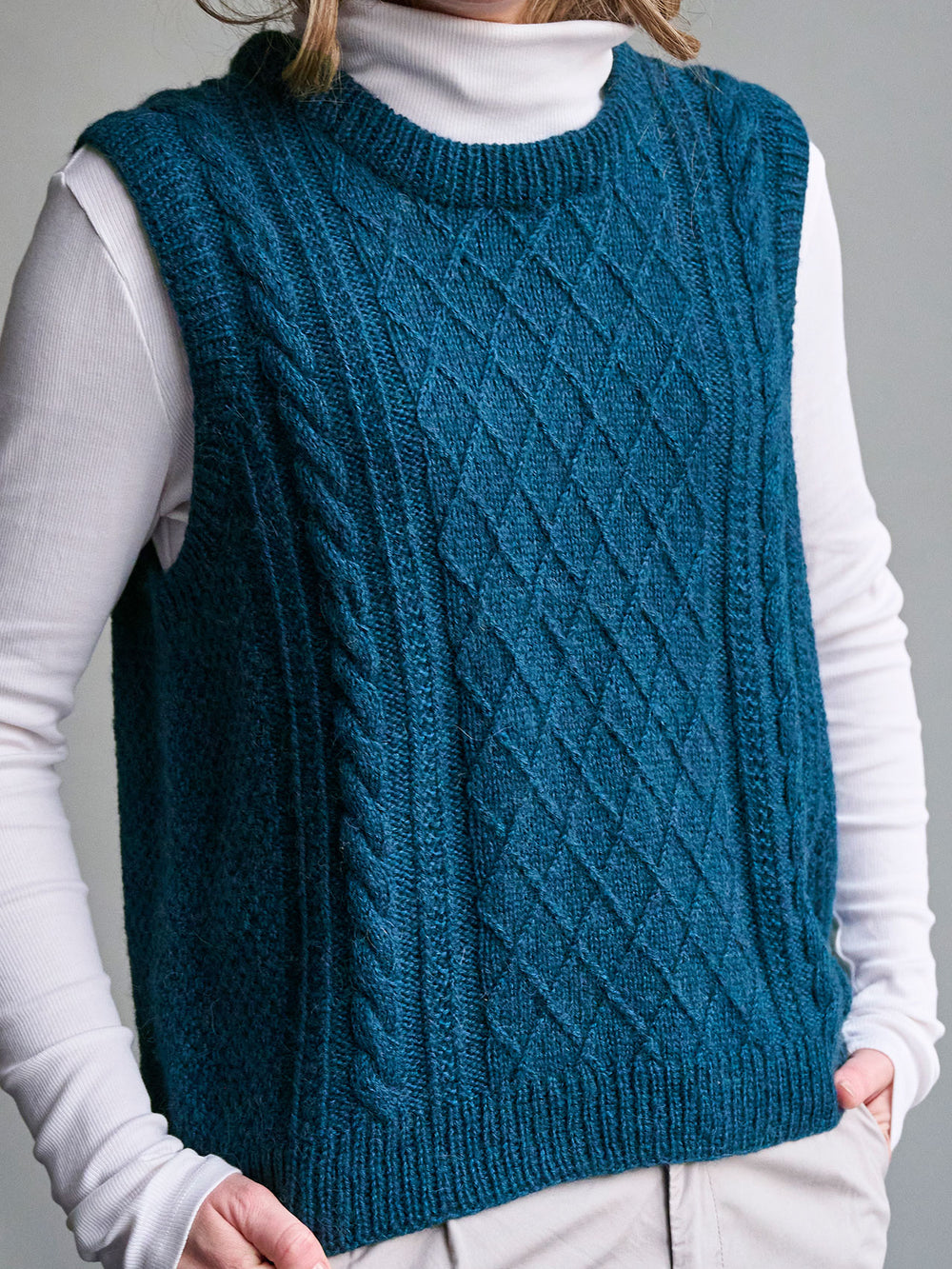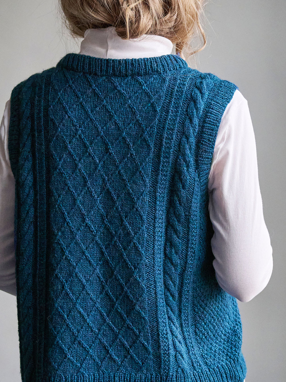 Moby slipover från PetiteKnit stickas uppifrån och ner med flätor och strukturstickning på både fram- och bakstycket. Kanterna stickas i resår.