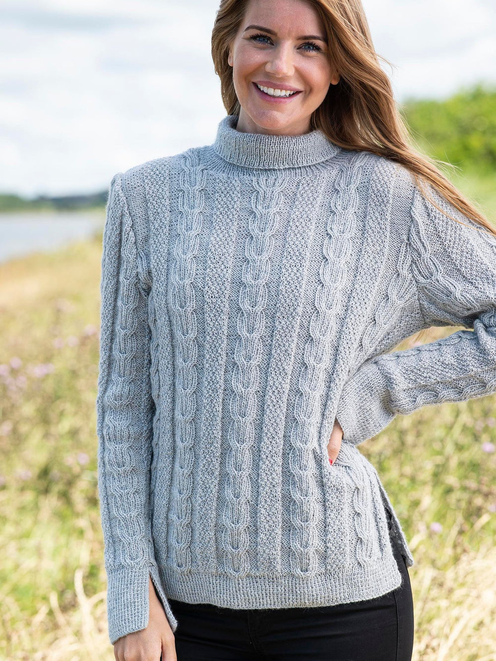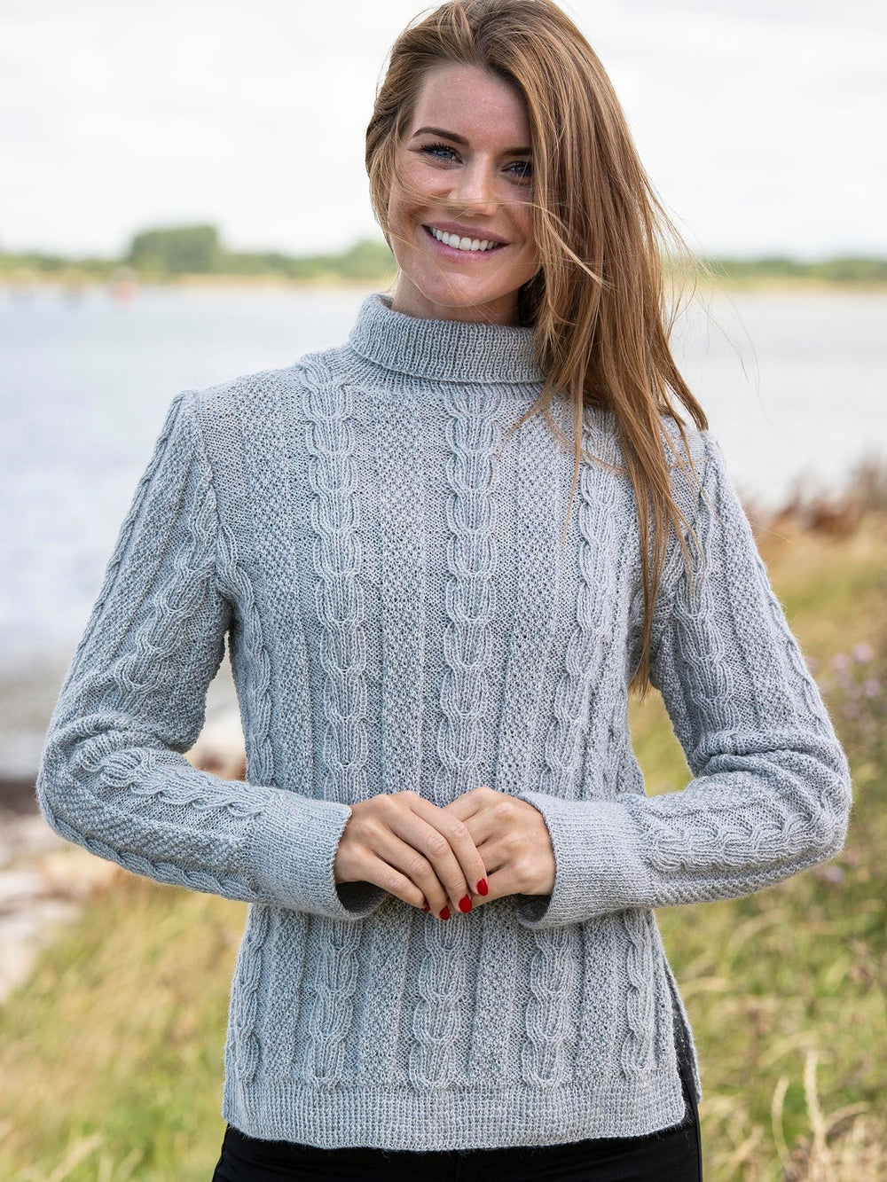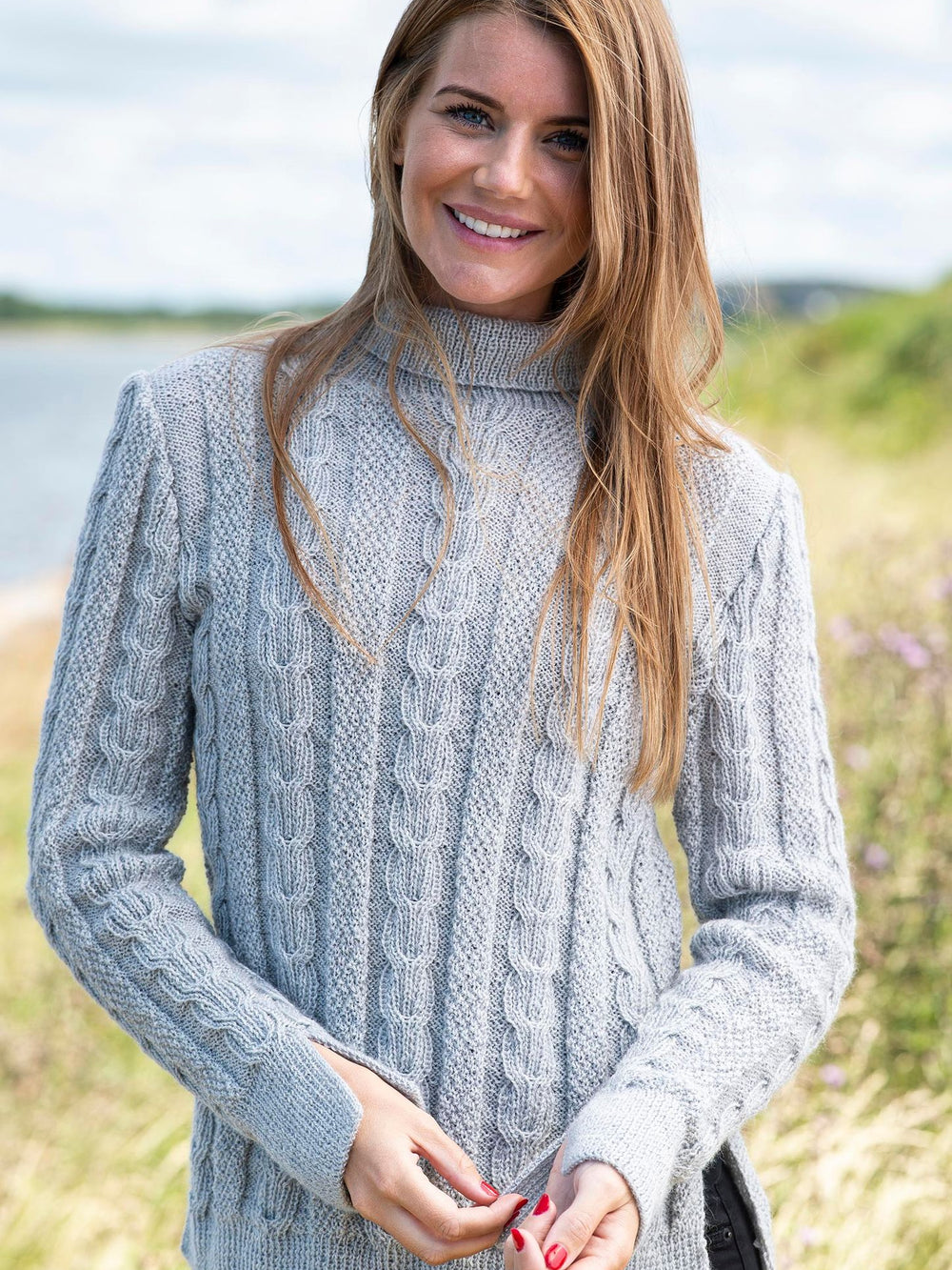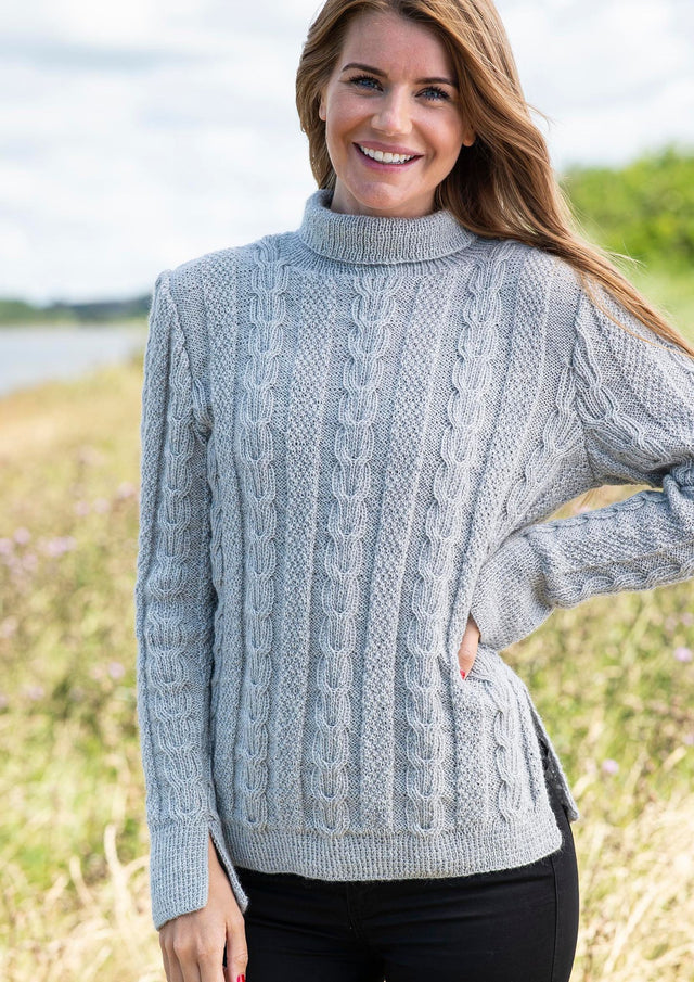 Denna vackra tröja får ett feminint uttryck tack vare det eleganta mönstret som återkommer över hela plagget. Mönstret skapas genom att kombinera flätor och pärlstickning, vilket gör tröjan mycket sofistikerad. Det feminina intrycket förstärks ytterligare av de små slitsarna på båda sidorna av tröjan samt den fina ribbade halsen, som är vikt för att ge extra volym och kontrast.
