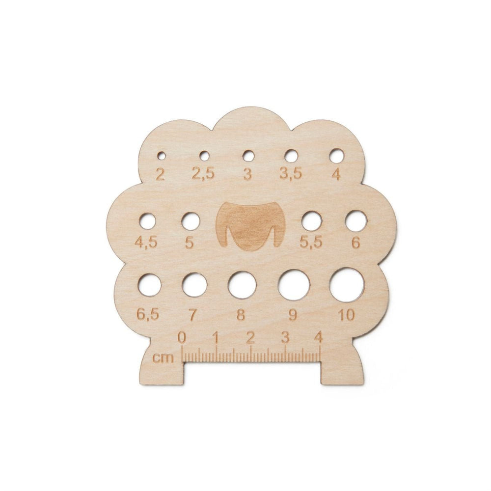 Stickningsnålar i trä, som är formade som ett får. Med denna sticknålmätare kan du enkelt och snabbt se vilken storlek din sticknål är. Stickstickmätaren kan mäta storleken på sticknålar från 2,0 mm och upp till 10,0 mm. Om du inte kan få sticknålen i hålet kan du prova ett större hål tills du kan få igenom det. Du har alltså hittat storleken på din sticknål.
