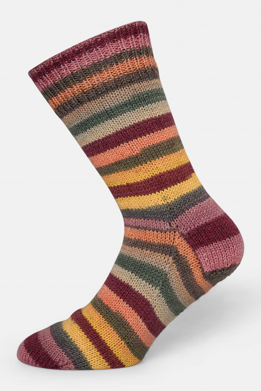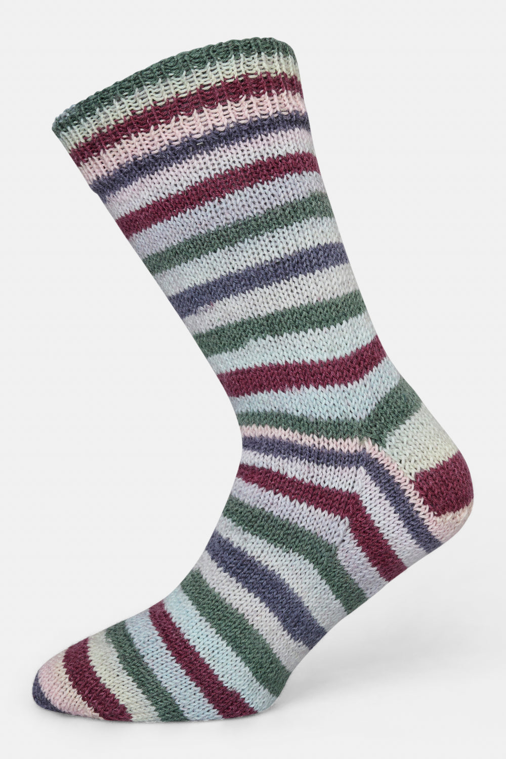 Strumporna är stickade i det underbara strumpgarnet Mayflower Premium Sock Wool Ocean, som är spunnet med 75% värmande ull och 25% slitstark polyamid. Den lyxiga ullen håller fötterna varma, medan polyamiden ger hög slitstyrka och strumpor för flera års användning. Med andra ord är Premium Sock Wool ett strumpgarn av mycket hög kvalitet. Ocean-serien ger strumporna ett randigt mönster.