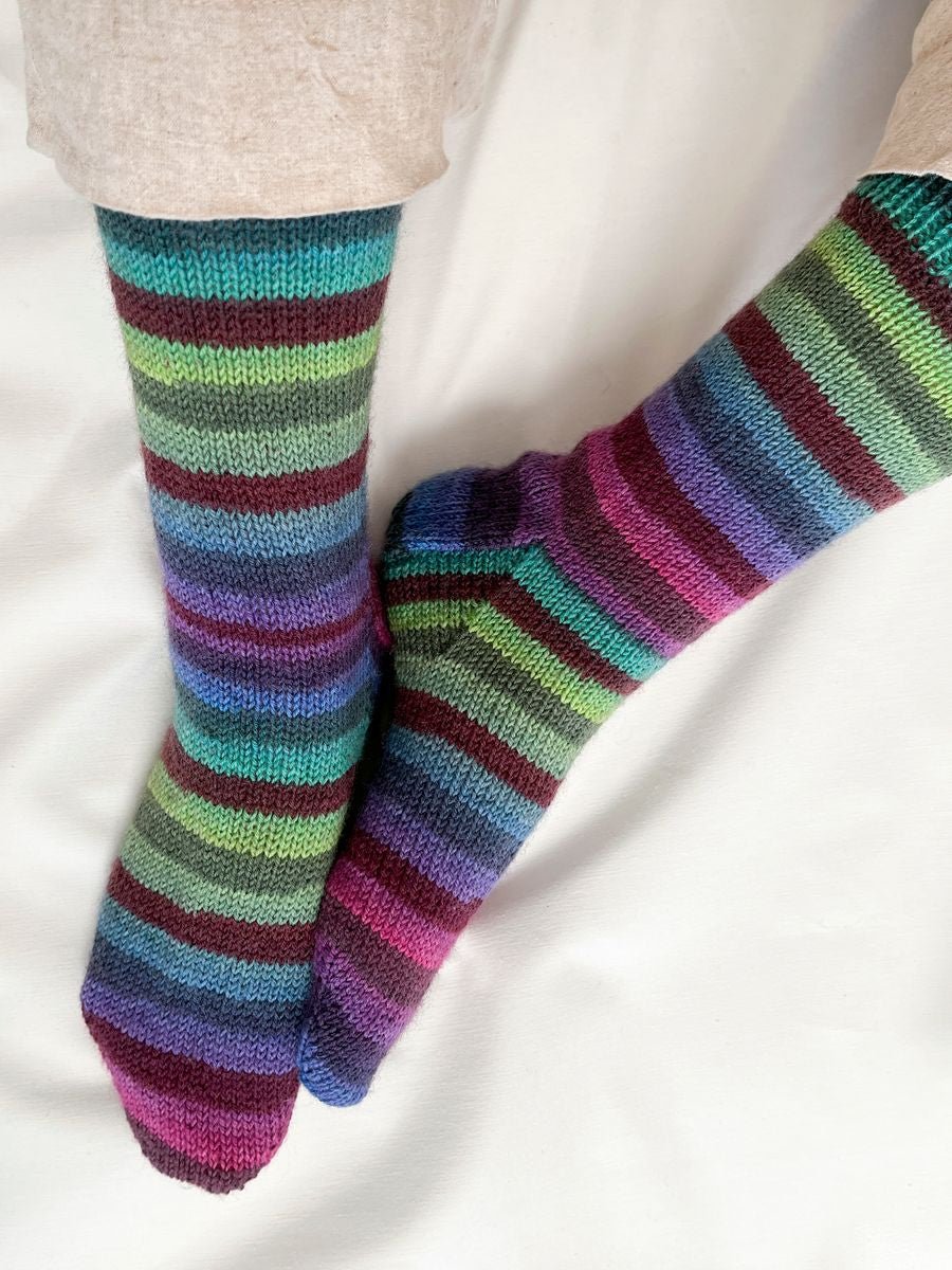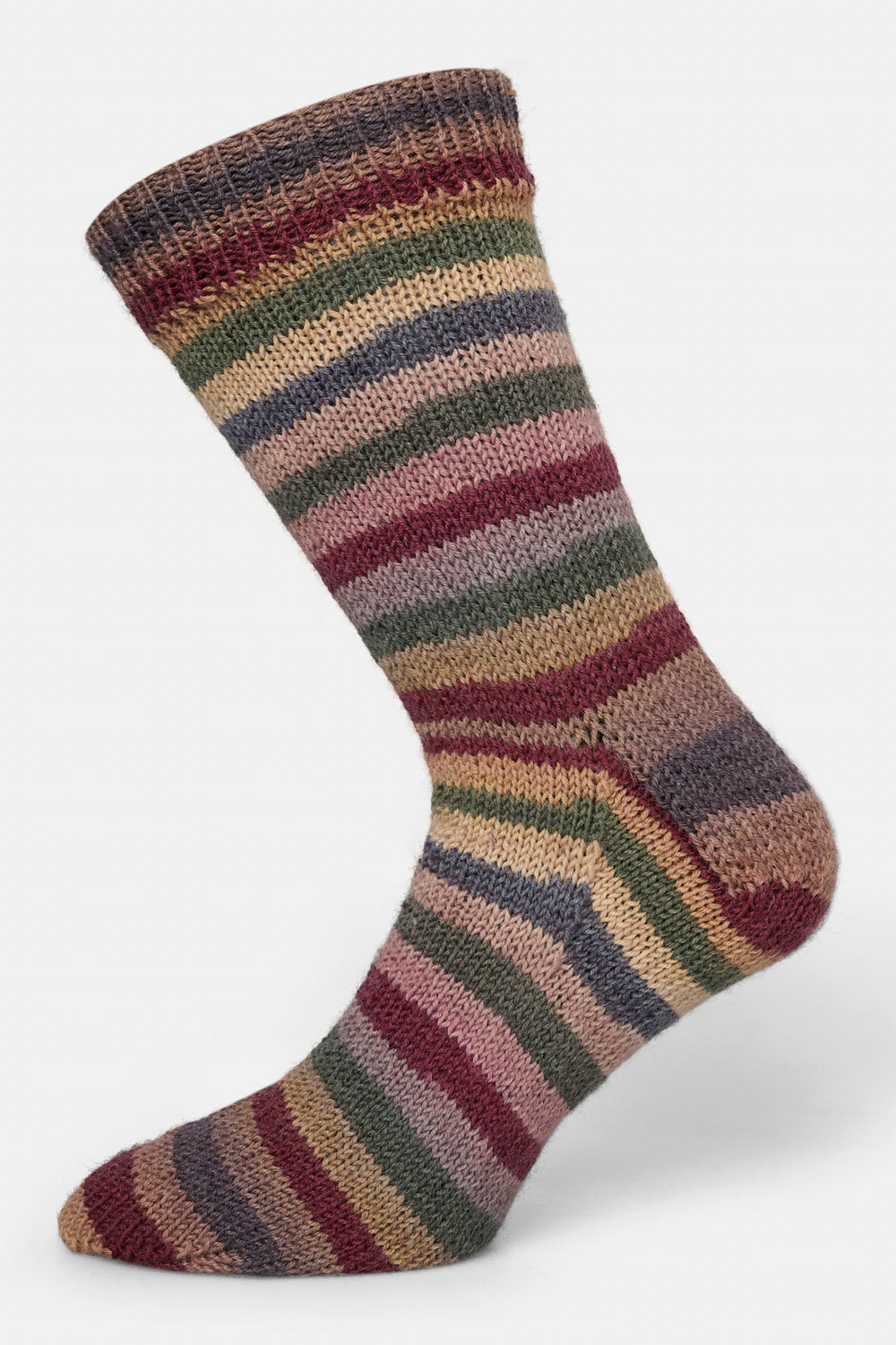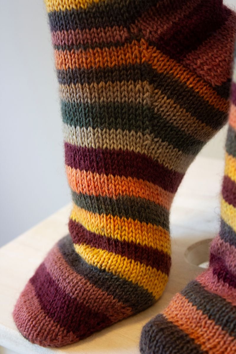 Strumporna stickas i slätstickning med en ribbkant upptill. Med slätstickning kan du snabbt sticka både skaft och sula, och mönstret hjälper dig bra igenom både häl och tå. Slutresultatet blir ett par härliga och bekväma strumpor med ett fint randigt mönster.