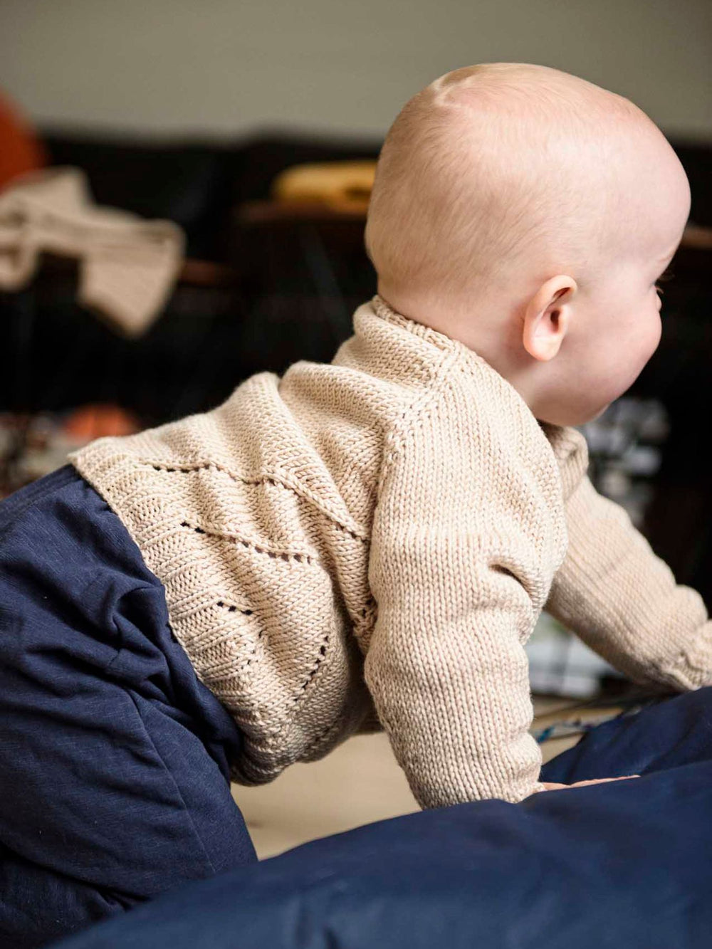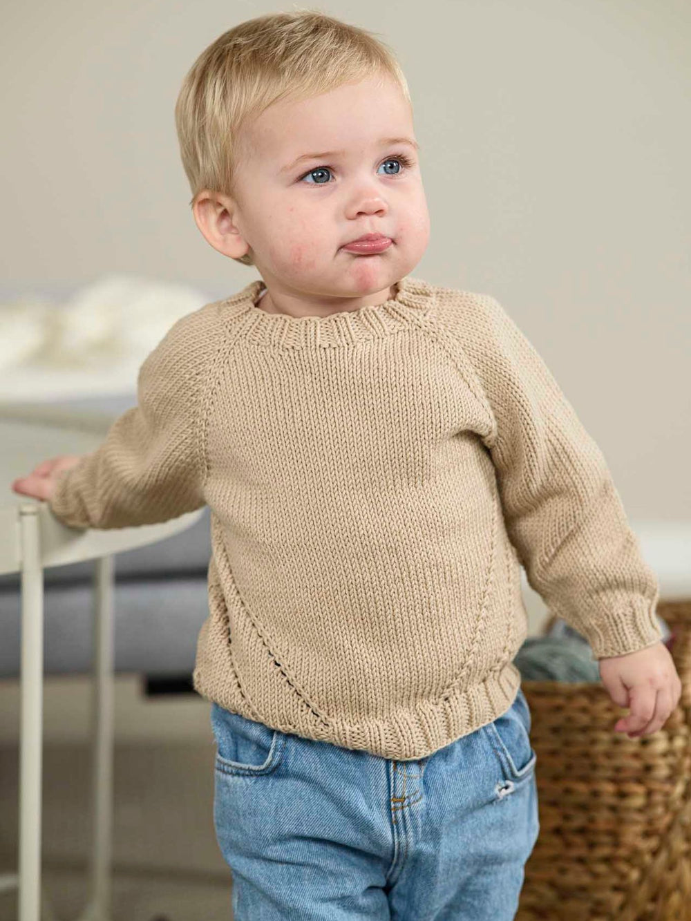 Tröjan stickas uppifrån och ner med förkortade varv och raglanökningar. På kroppen, under ärmarna, stickas ett fint, diagonalt mönster som ger tröjan ett unikare uttryck. Tröjan stickas i slätstickning och har ribbkanter vid halsringningen, ärmarna och längst ner på tröjan.