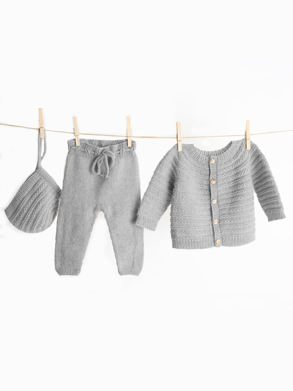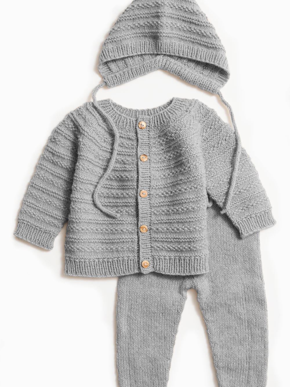 Mjukt och exklusivt babyset bestående av byxor i slätstickning samt en hjälmmössa och en kofta med ett genomgående strukturmönster. Mössan är stickad i ett dekorativt mönster och knyts med en i-cord-snodd som håller den på plats. Koftan stickas uppifrån och ner i strukturmönster med ökningar i oket och dekoreras med knappar. Byxorna har en enkel konstruktion i slätstickning med ribbkanter och hålvarv för en i-cord-snodd.