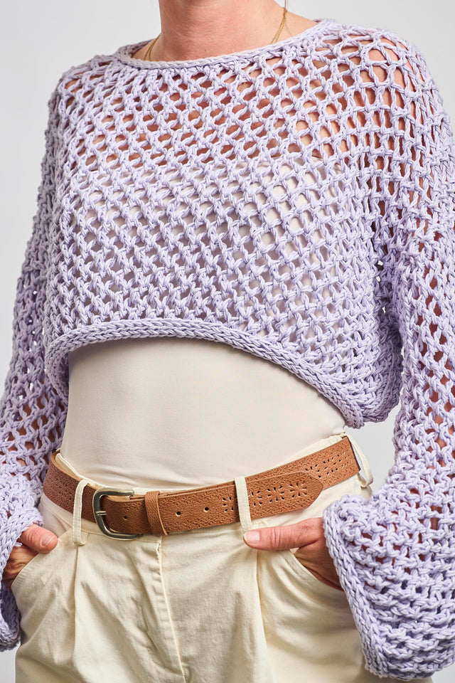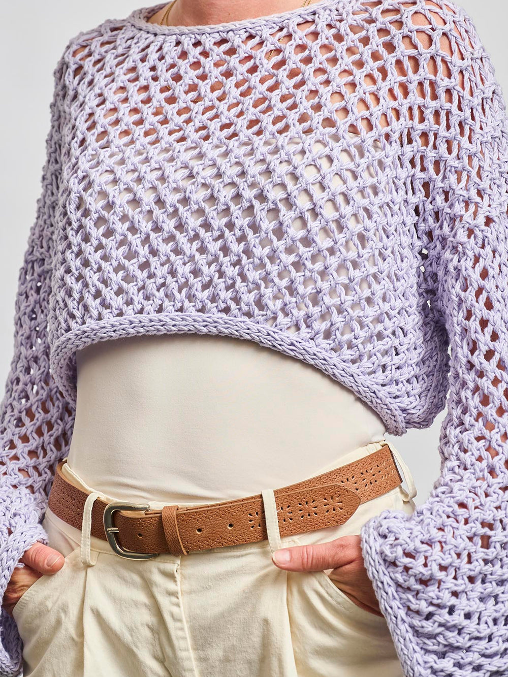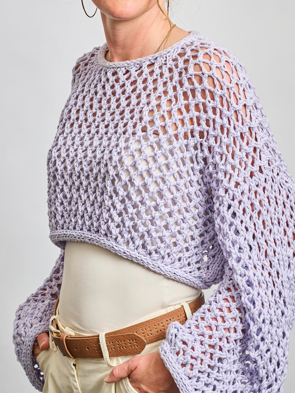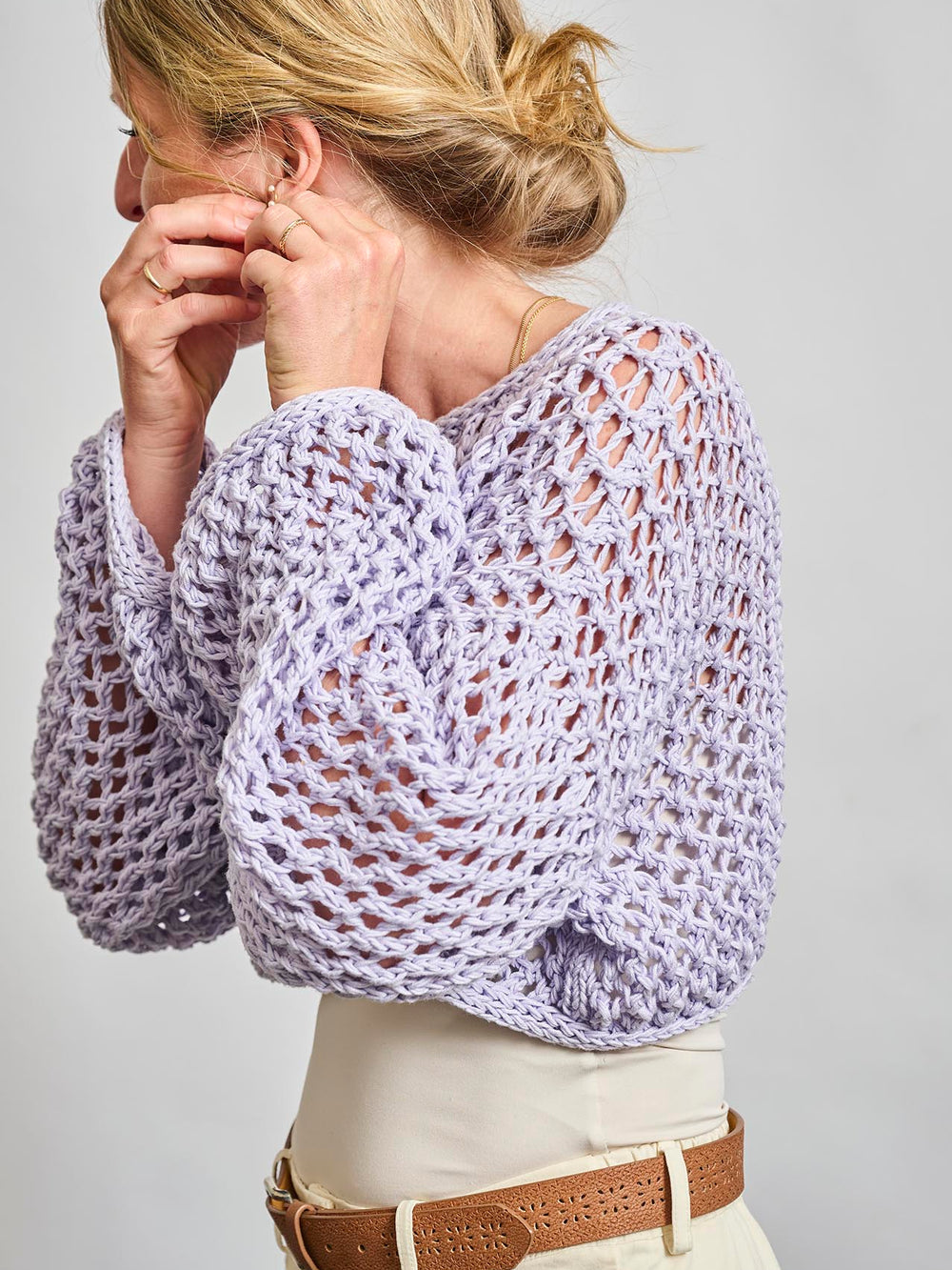 Stickad top som stickas i ett luftigt meshmönster. Toppen har en lös passform i oket och över bysten samt generös vidd i ärmarna. Designen är därför mycket lätt och luftig. Toppen stickas uppifrån och ner.