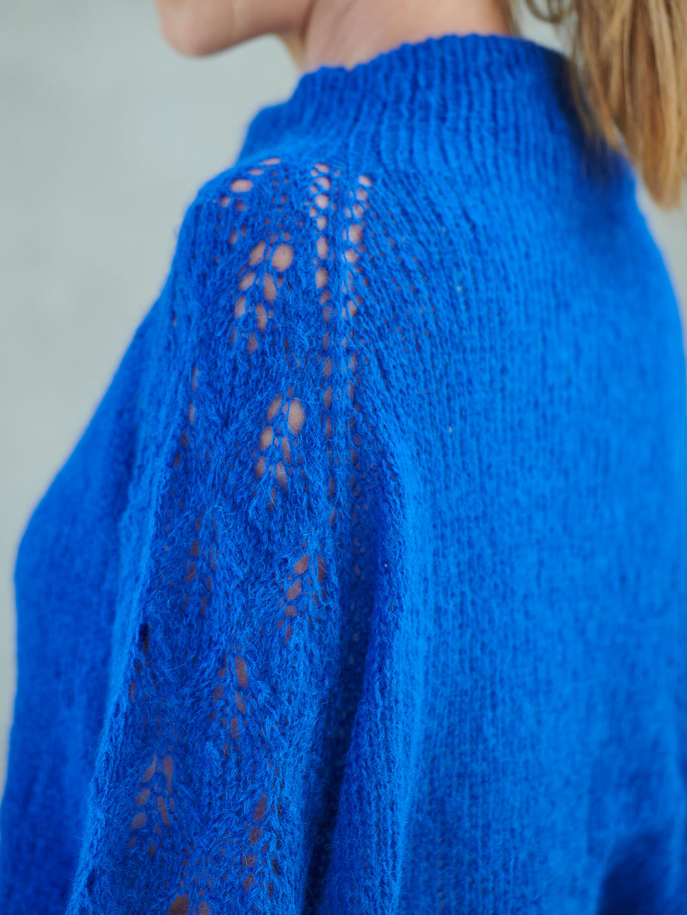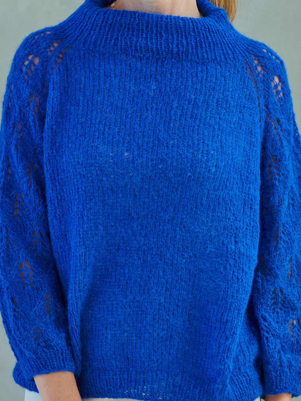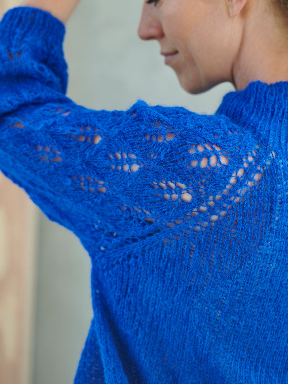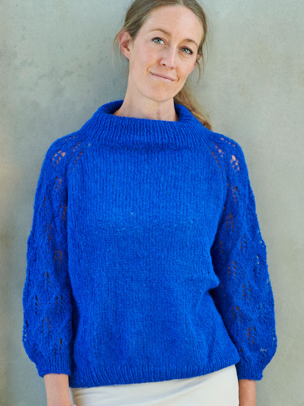 Underbart lätt och luftig blus med mönstrade 3/4-ärmar och en vacker halskrage. Rønbjerg-toppen stickas uppifrån och ner, och du börjar därför med den breda halskragen. Toppens fram- och bakstycke stickas i slätstickning, medan ärmarna stickas i ett elegant bladmönster. Den stora halskragen faller vackert och formar halsringningen helt av sig själv.