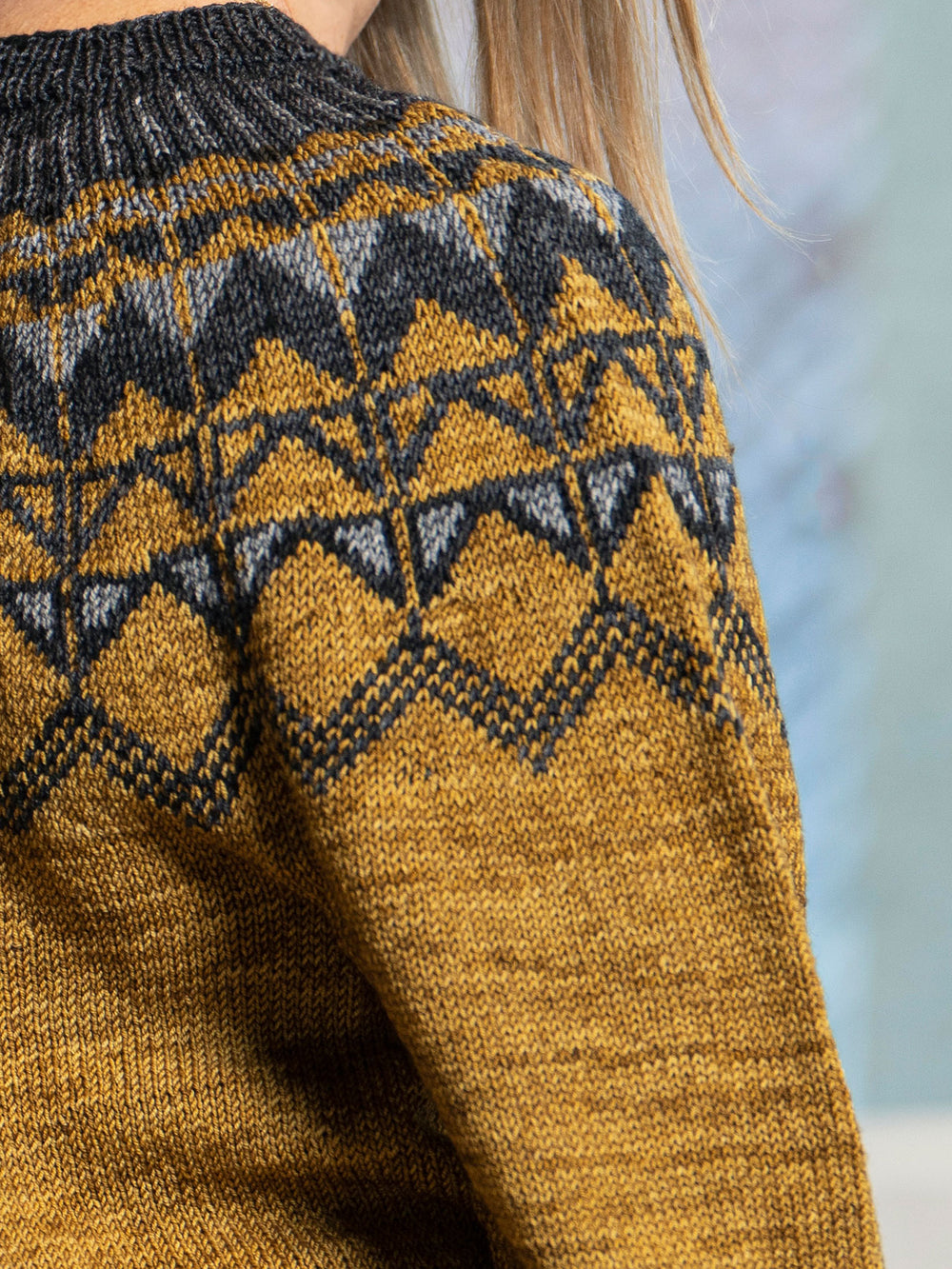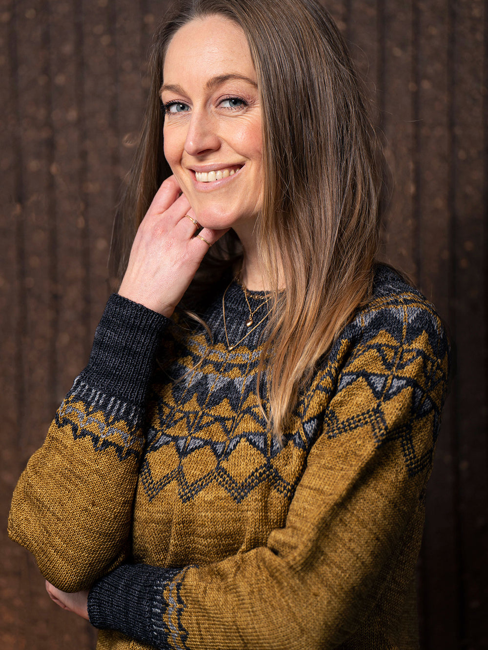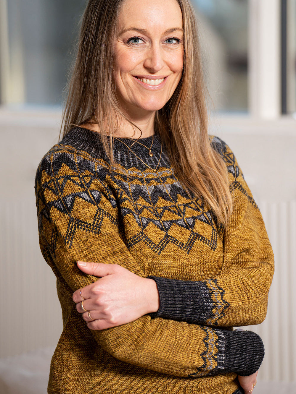Ronja-tröjan är stickad i det handfärgade Mayflower Amadora, vilket ger ett fantastiskt färgspel. Mönstret på oket, som är en nytolkning av klassiska isländska tröjor, framhäver färgerna på ett vackert sätt. Ronja-tröjan stickas uppifrån och ner, vilket gör att den inte kräver någon montering.