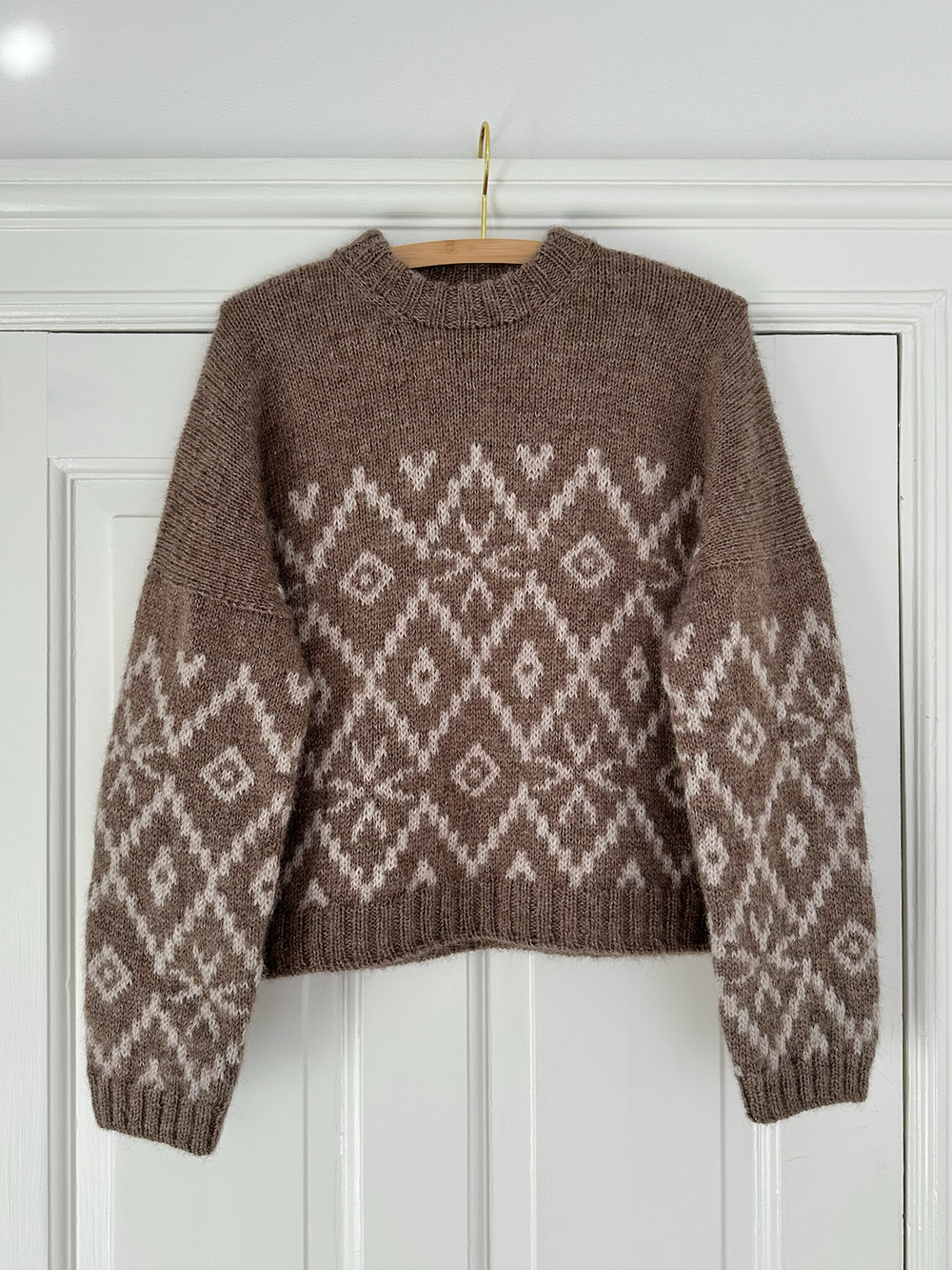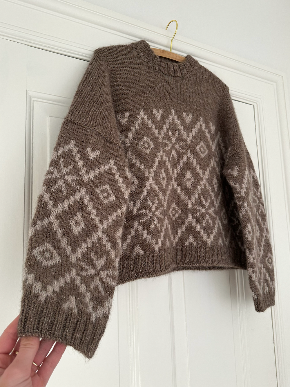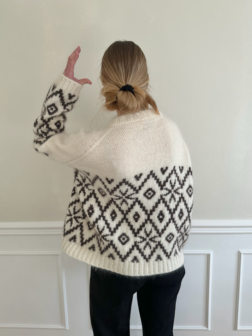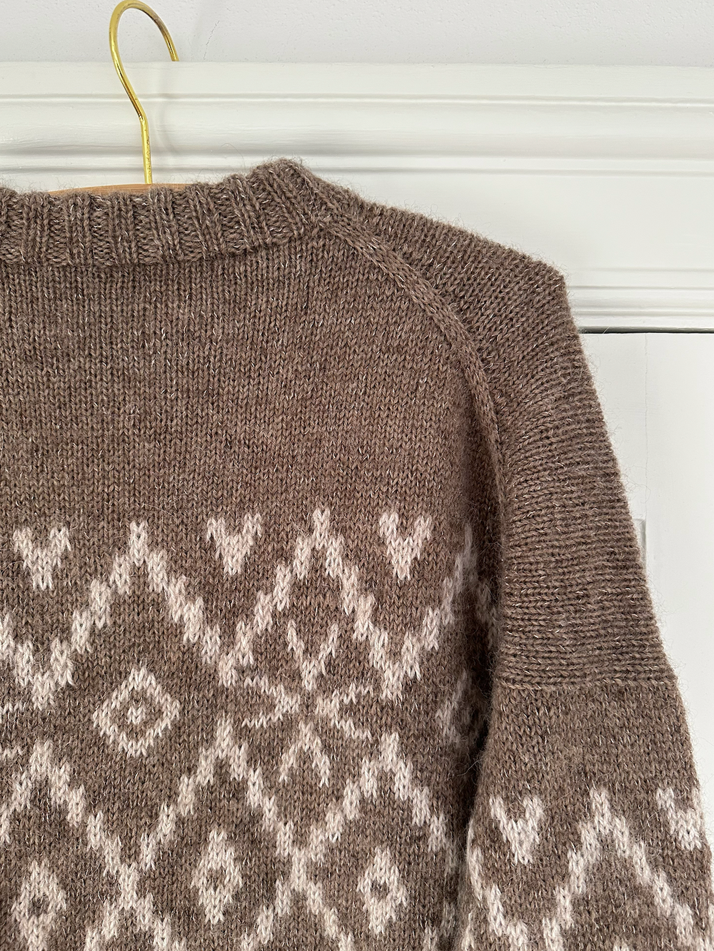 Tröjan stickas uppifrån och ner. Först läggs maskor upp till bakstycket, som stickas fram och tillbaka med ökningar i varje sida. Därefter plockas maskor upp för vänster och sedan höger axelstycke, vilka sammanfogas till framstycket. Framstycket och bakstycket sammanförs till kroppen, som stickas runt i slätstickning och avslutas med en resårkant. Därefter plockas maskor upp för halskanten, som stickas runt i dubbelresår. Slutligen stickas ärmarna genom att maskor plockas upp längs ärmhålet, och ärmarna stickas runt i slätstickning med minskningar på undersidan.