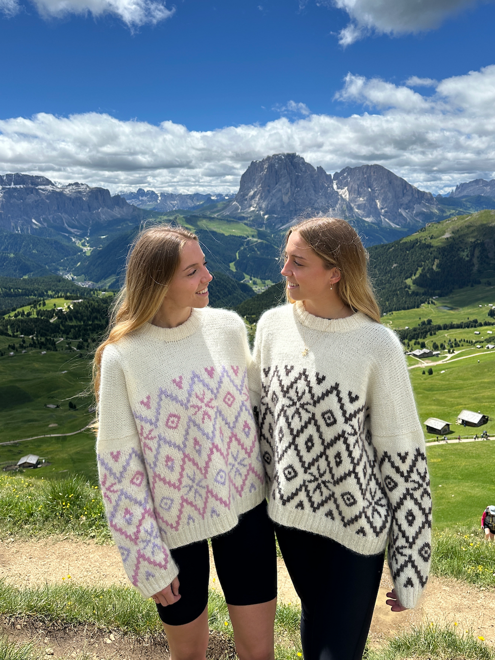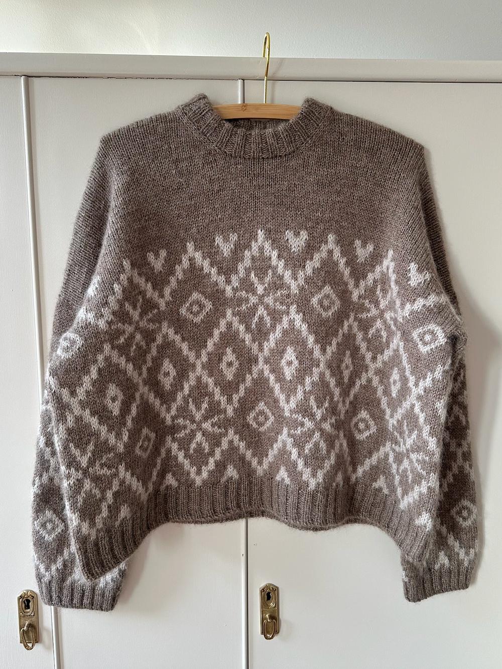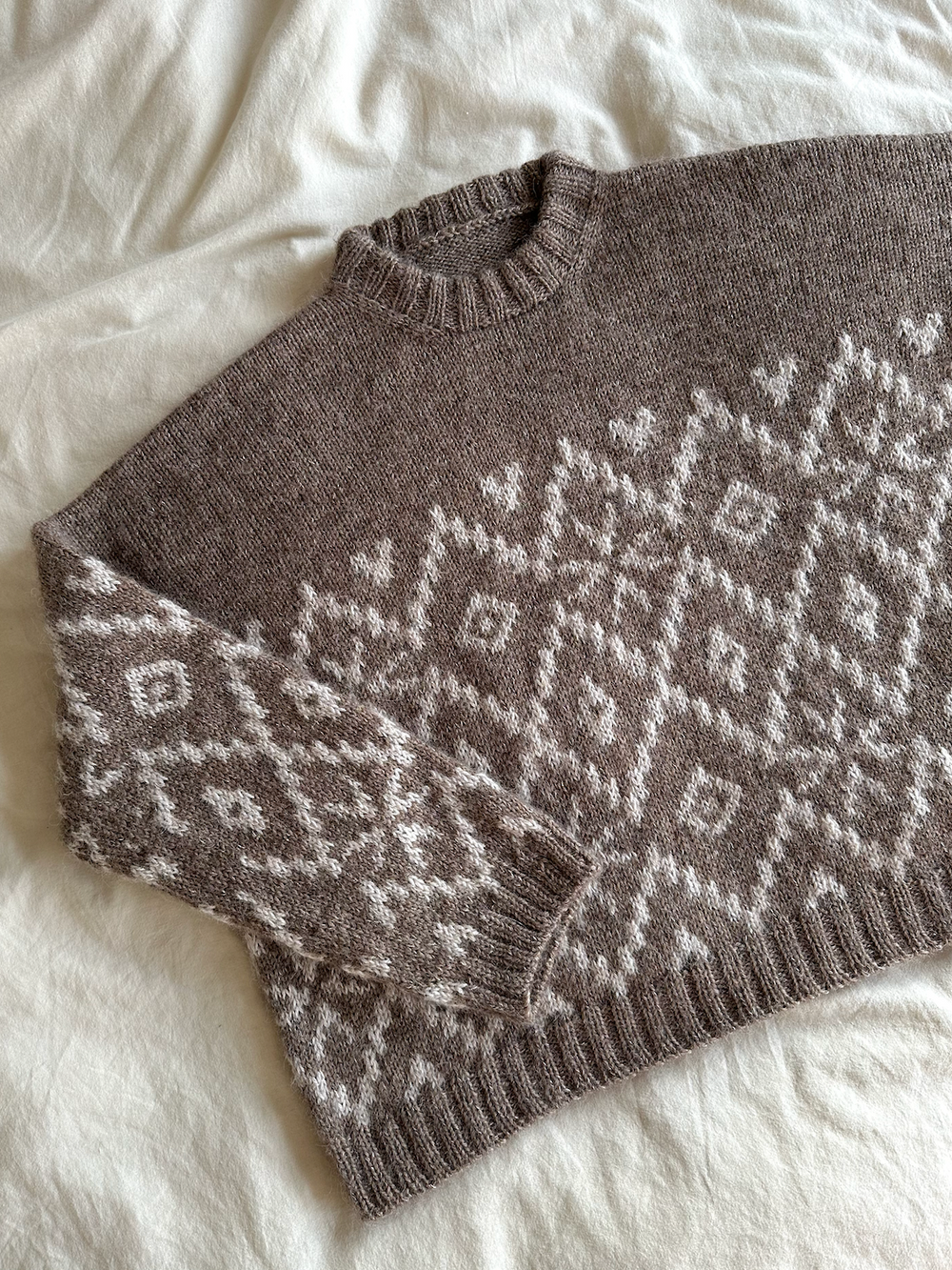 Tröjan finns i tre storlekar: XS-M (M-XL) 2XL-4XL, anpassade för bystmått på 75–95 (95–110) 110–140 cm. Den färdiga tröjans omkrets är 109 (127) 145 cm, och vi rekommenderar en rörelsevidd (positive ease) på 10–35 cm beroende på önskad passform.
