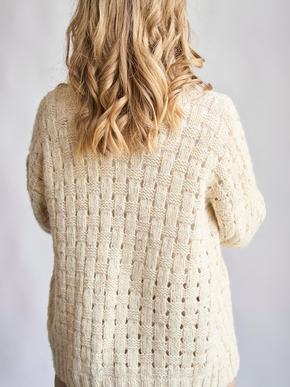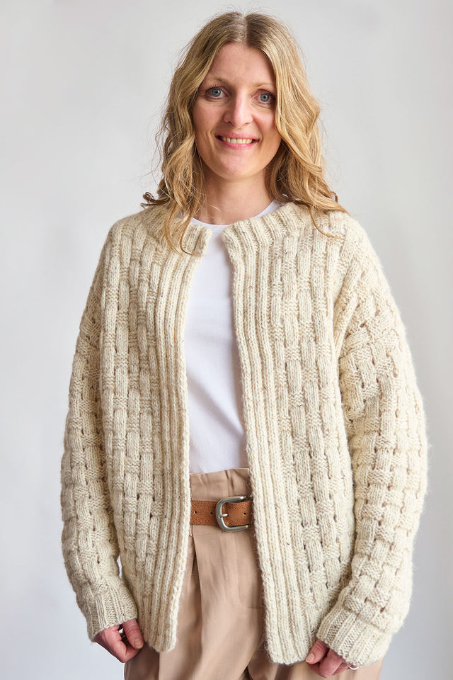 En mysig och mjuk kofta stickad nerifrån och upp i ett vackert flät/rutmönster.